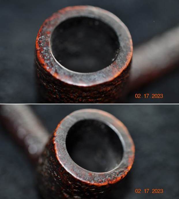 Jeff took close up photos so that I could have a clearer picture of the condition of the bowl, rim edges and top. The rim top photos confirm my assessment above. The cake in the bowl is quite thick and the rim top has lava and debris on it. You can also see the condition of the outer edge but the inner edge is a bit of a mystery at this point. This is what I look for when assessing a pipe. While there is lava and darkening there is no visible burn damage at this point. The bowl is still fairly round.