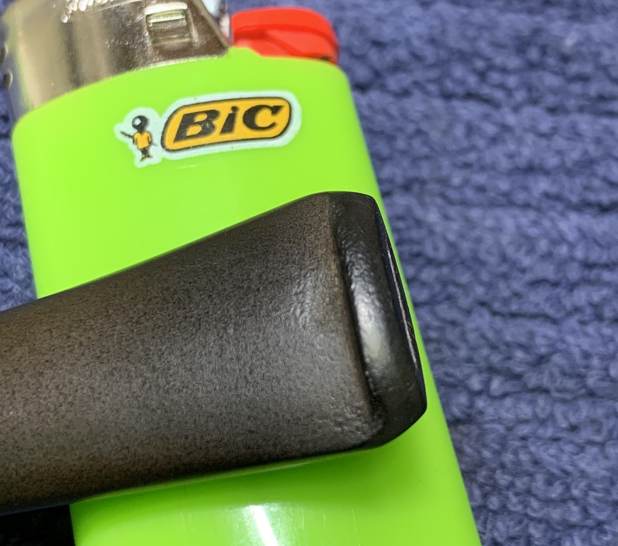 The bowl of the pipe looked good. The rim top is clean but there is some darkening on the beveled inner edge of the bowl on the back right side. There was a burn mark on the rim top at the front of the bowl. There does not seem to be any damage to the smooth finish. I see no warning signs in the rim top or the edges of the bowl. I took photos of the stem to show the condition of it. Though hard to see there are light tooth chatter on the surface of both sides ahead of the button but it should clean up easily with polishing.