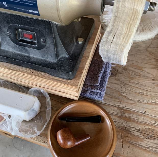 The next photo captures the flattened heel of the bowl. It is still roughly finished and will need some sanding. I removed the stem from the shank and took a photo of it to give a sense of proportion.