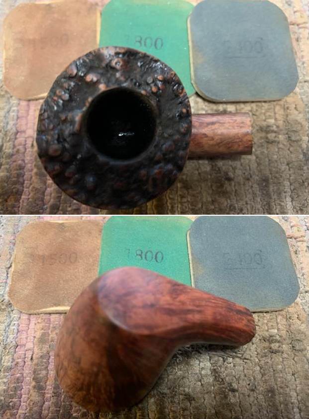 I forgot to take a photo of the rim top after the clean up but it looked much better. You can see it in the stained rim top photo below. I stained it with an Oak stain pen to match the surrounding briar.