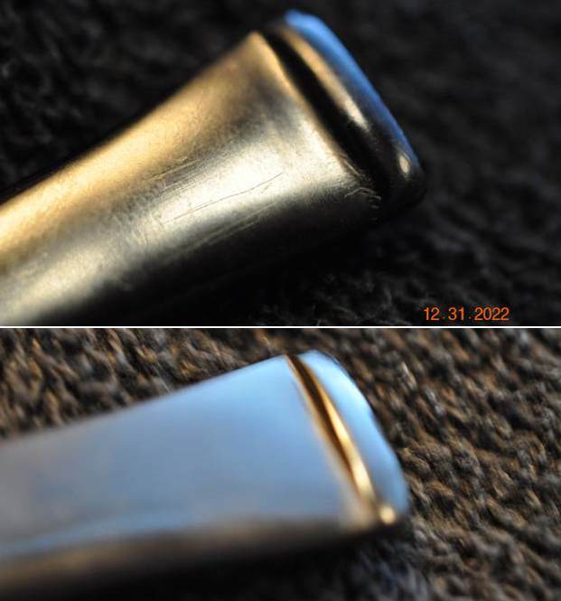 I carefully went over the bowl and rim top to get a sense of what is happening there. In this case once the rim top and edges were cleaned, they looked very good. There was no damage on the edges or the top of the rim. The thin rim edge and top are clean and should polish up well. I also go over the stem carefully. The stem had some issues as noted. The diameter of the stem was larger than the shank and the end had been rounded giving it shoulders. That would need to be addressed. There were some faint tooth marks chatter on the surface of the stem. I took photos of the rim top and stem sides to show as best as I can what I see when I look at them.