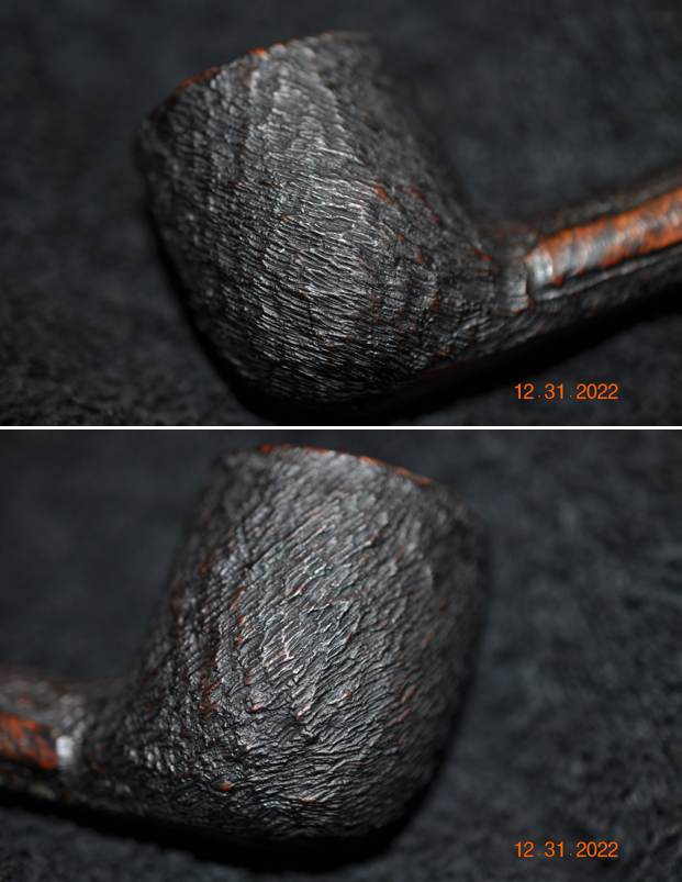 Instead of telling you what I see in the next photos of the sides of the bowl and the heel I want to hear from you. Tell me what you see? What does the finish look like to you? Are there any visible problems or issues that stand out to you? Are the cracks or scratches in the valleys of the rustication or the high spots? Are there visible flaws or fissures in the briar? How random does the deep rustication look? Is there a pattern to it? Any visible issues on the heel of the bowl? These questions should help you to see what I am looking for when I see these photos.