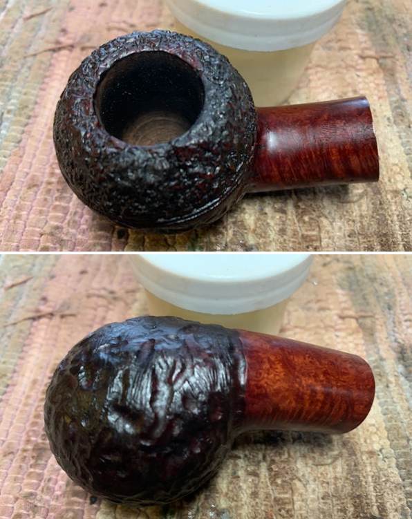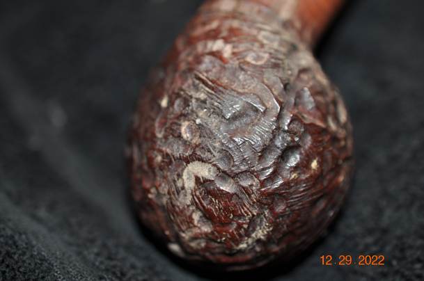 - The finish is dirty and there is dust, grime and grit ground into the rustication. The carving of the rustication rugged and wide open. There rustication on the cap is different and tighter in pattern than the bowl.