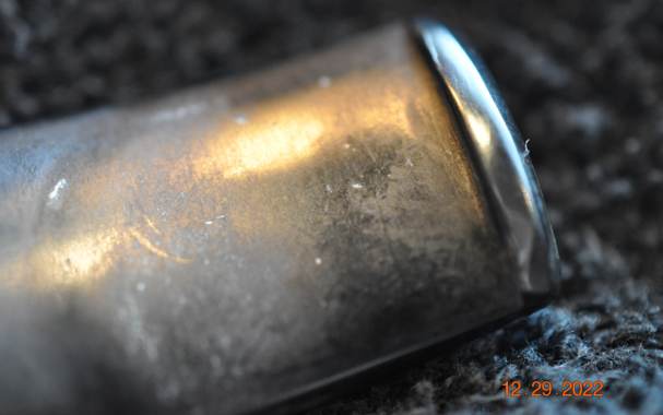 He took a photo of the stamping on the left side of the shank. It bears the signature of Mark Tinsky and no other stamping – no American stamp or otherwise. The vulcanite stem does not have either of the standard Tinsky logos inset on the side of the stem. What stands out for you in the photos of the stamping? What do you look for in the stamping? It is dirty but what do you see underneath the grime on the surface of the briar?