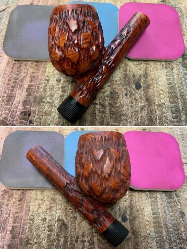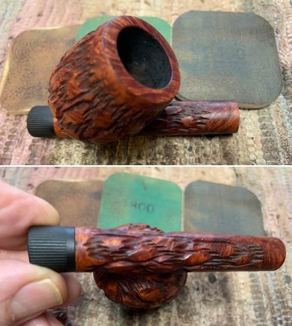 I set the bowl aside and turned my attention to the stem. I smoothed out the chatter and marks on the stem surface and button on both sides with 220 grit sandpaper. I started the polishing process with 600 grit wet dry sandpaper. It is taking on a shine.