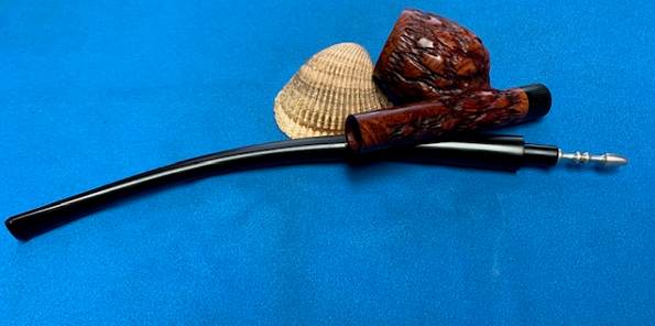 The final steps in my process involve using the buffer. I buffed the stem with Blue Diamond to polish out the light scratches in the acrylic. I gave the bowl multiple coats of Conservator’s Wax and the stem multiple coats of carnauba wax. I have found that I can get a deeper shine if I follow up the wax buff with a buff with a clean buffing pad. It works to raise the shine and then I hand buff with a microfiber cloth to deepen the shine. It is always fun for me to see what the polished bowl looks like with the polished stem. It really is a nice pipe. The mix of smooth and rusticated finishes around the bowl sides and shank looks great with the rich black and brown stains. The Weber Cavelier Style Churchwarden with a rusticated finish feels great in my hand. It is a well balanced pipe. Have a look at it with the photos below. The dimensions are Length: 11 inches, Height: 3 inches, Outside diameter of the bowl: 1 ¼ inches, Chamber diameter: ¾ of an inch. The weight of the pipe is 1.69 ounces/49 grams. It is a beautiful pipe that I will soon be adding to the rebornpipes store in the American Pipemakers section. If you would like to add it to your collection let me know. It should be a great smoking pipe.