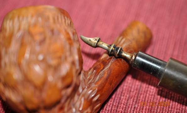 - The long vulcanite stem is dirty, oxidized, calcified and has light tooth chatter and marks on both sides ahead of button. There is no logo on the sides of the stem.