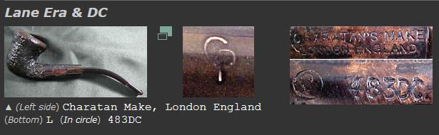 – Shank: The shape code is stamped on it together with the nomenclature “CHARATAN’S MAKE LONDON ENGLAND” arranged in two lines. From 1955 onward on the models marketed for the USA there is also a serif and circled capital “L” (but not all models bear this) which resembles the pound sterling symbol. The “L” is for Lane, the importer.