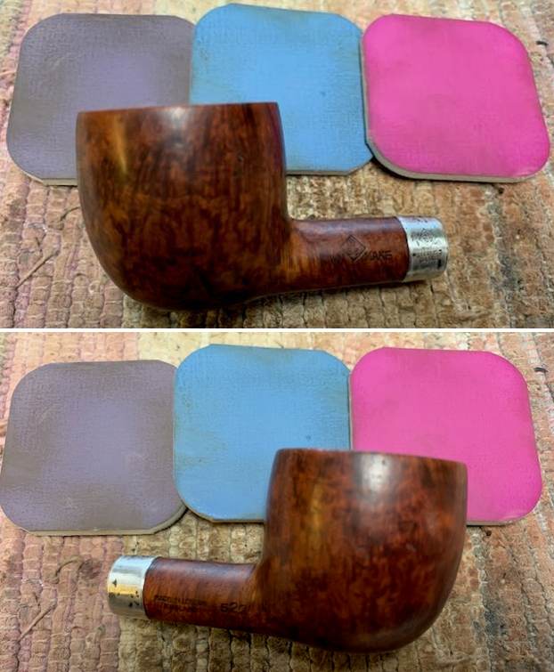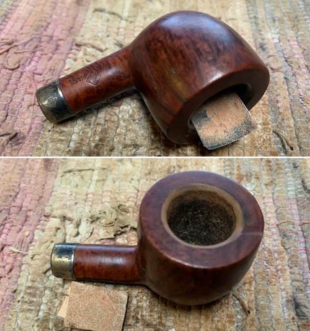 I took a photo of the bowl and rim top to verify the description above. The rim top looks good other than the burn mark on the inner edge at the right front of the bowl. The Sterling band is also very tarnish and dark in the photos. I also took photos of the stem surface showing how clean it was on both sides.