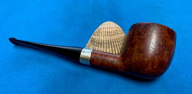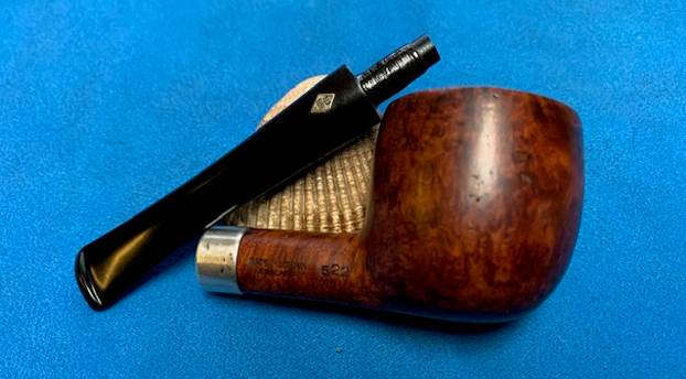 This is another pipe that I have taken out of my personal collection as I just do not use enough to warrant keeping it. This pipe was one that I purchased long ago but have no memory where it came from. I don’t think I ever smoked it to be honest. It is a pipe I should have smoked as it is attractive enough but did not. It is time to move it on to someone who will enjoy it. The airway in the shank and the mortise are very clean. The smooth finish and rim top were in good condition but it is dull and lifeless looking. The inner edge of the rim has a bit of damage on the right side toward the front. The stamping on the pipe on the left side of the shank reads BBB in a diamond flanked on either side by Own (left) and Make (right). On the right side it is stamped Made in London [over] England followed by the shape number 522. There is a Sterling silver band on the shank that is cosmetic as there are no cracks. It is stamped with the BBB in a diamond logo [over] Sterling Silver. It is tarnished and has some small dents in the surface. The finish is a medium brown. Once it is polished the grain will show clearly. The colour of the stain goes well with the black vulcanite stem. There is a BBB Diamond brass inset logo on the top of the stem. The stem is in excellent condition with no tooth chatter or marks on it. It is dirty form sitting in my cupboard but otherwise looks goo. I took photos of the pipe before I did my clean up work on it to prepare it for you.