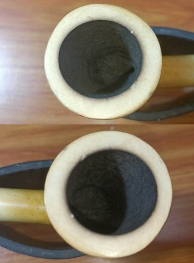 The stem is where maximum repair work is required. The stem has been spliced and repaired previously with the rounded slot end made of Amber while the tenon end is a similar colored variegated acrylic or plastic stem. The joint is easily discernible and is encircled in Red. Though the stem airway is aligned, the stem shape is not. The mismatched stem shape is indicated by green. The tenon is too short and filthy and very loose fitting in the shank. The slot end has tooth indentations and chipped surface. Given the present condition of the stem and its seating in to the mortise, I shall be replacing the stem itself to make it both functional and aesthetically appealing to the eye (that’s what the intention is!).