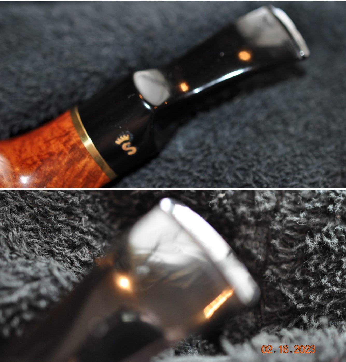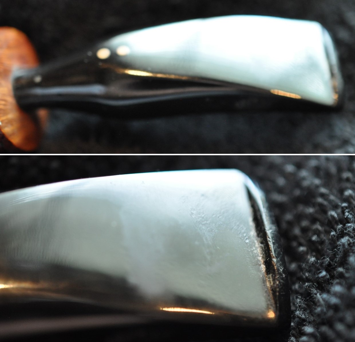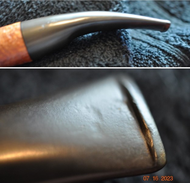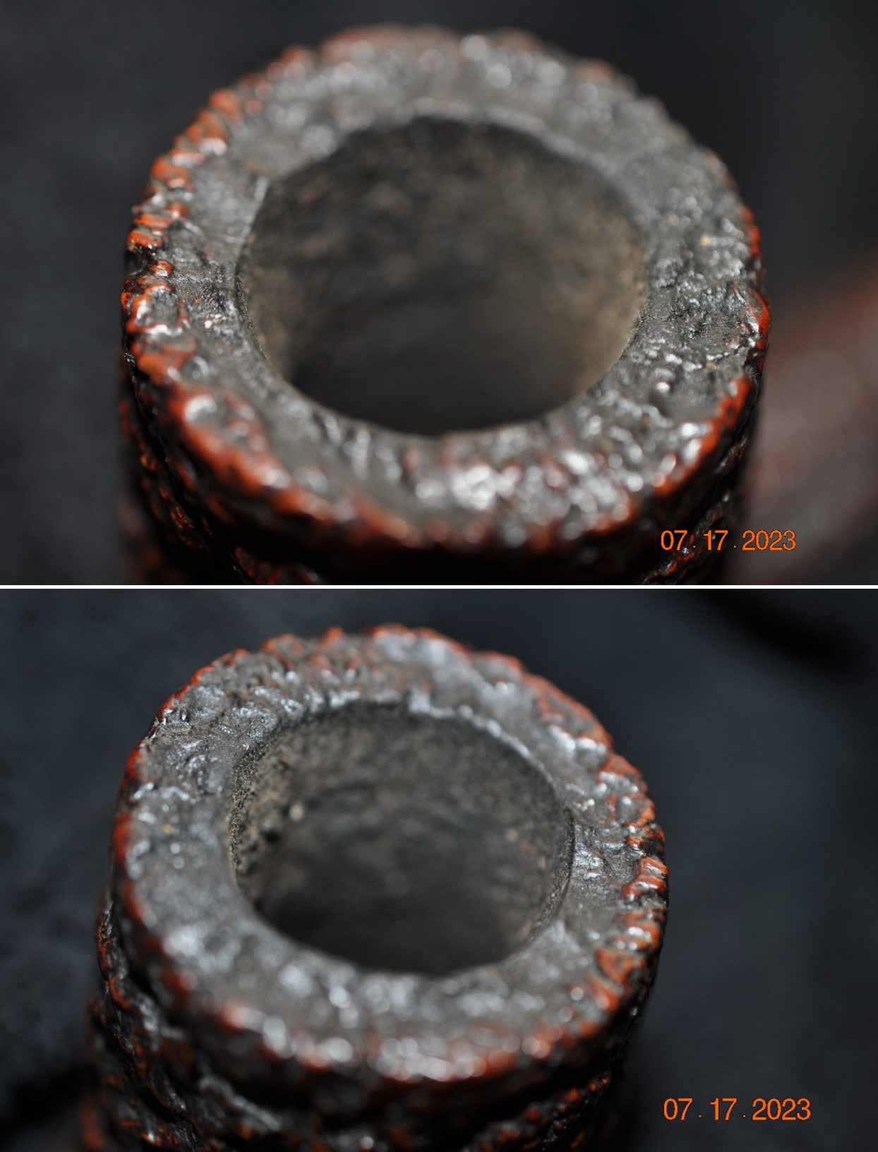 I took close up photos of both the rim top and the stem. Jeff had been able to get the grime and lava off of the rim top and it looked very clean. The stem looked very clean. The tooth marks and chatter were predominantly near the button.