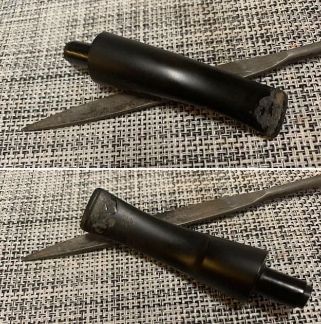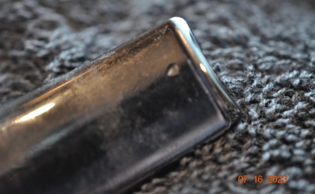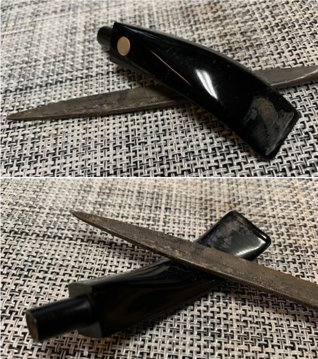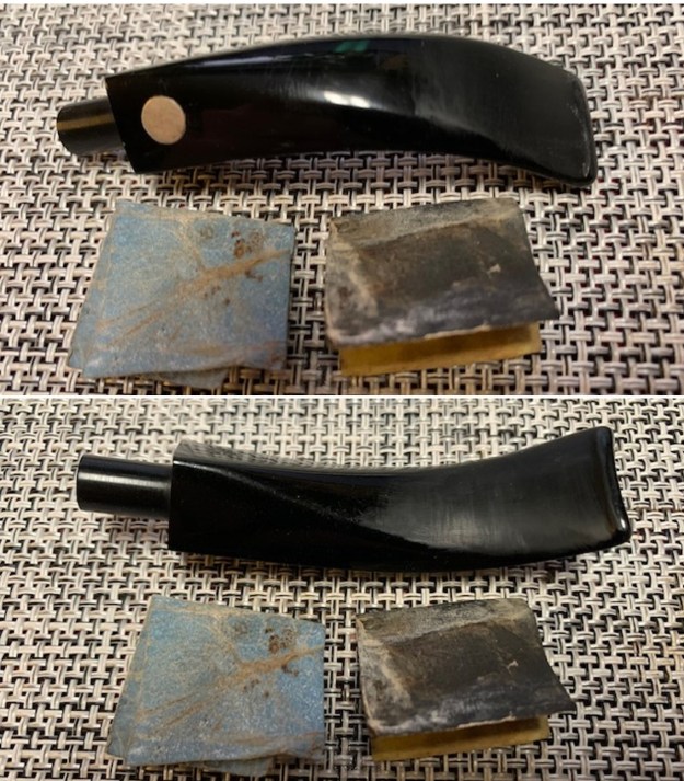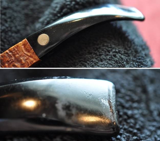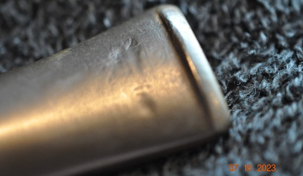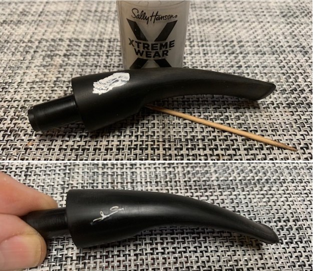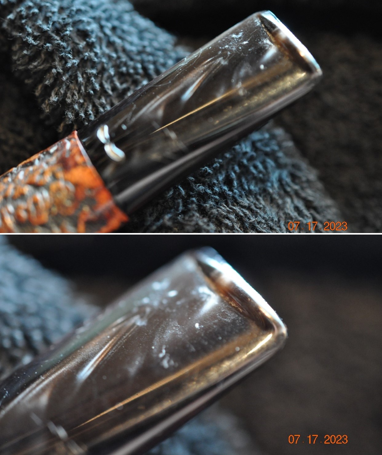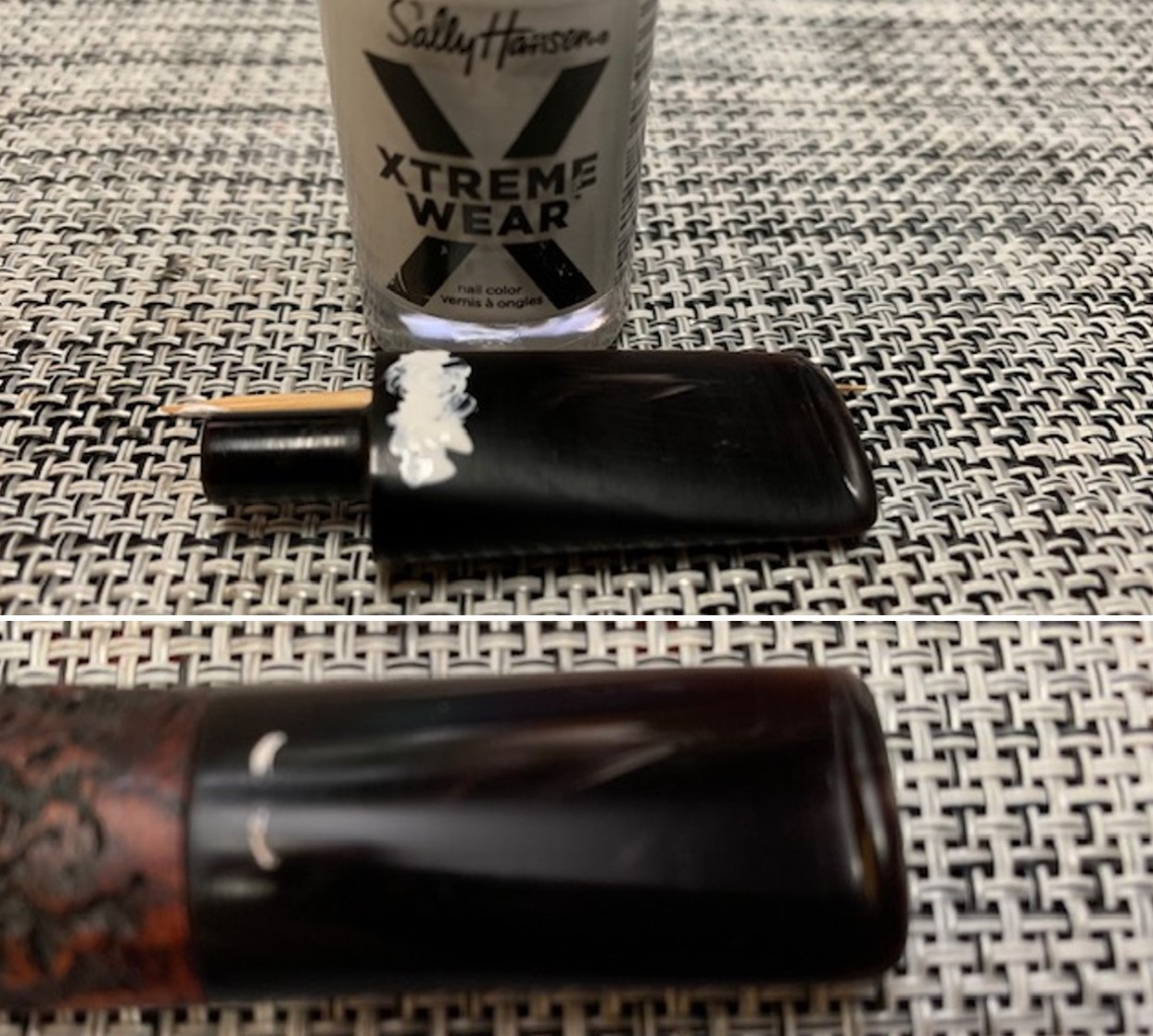I took close up photos of both the rim top and the stem. Jeff had been able to get the grime and lava off of the rim top and it looked very clean. The stem looked very clean. The tooth marks and chatter were predominantly near the button.
