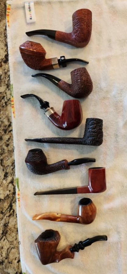A few weeks ago I was contacted from a fellow in Montana who was selling his pipes as they had not been used for quite a few years. I asked him for a picture and he sent me the one to the left. It included the following brands (from the top to the bottom of the photo): Savinelli Autograph 5 Freehand, Mastro de Paja Ciocco 0C Bulldog, Mastro de Paja Media 1B Bent Billiard, Ser Jacopo Delecta Octagonal Bent Billiard, Caminetto Business KS 118 Canadian, Radici Rind Rhodesian, Dunhill Bruyere ODA 836 Panel Billiard, Barontini Straight Grain B3 Freehand and a Ben Wade Martinique Hand Made in Denmark Freehand.