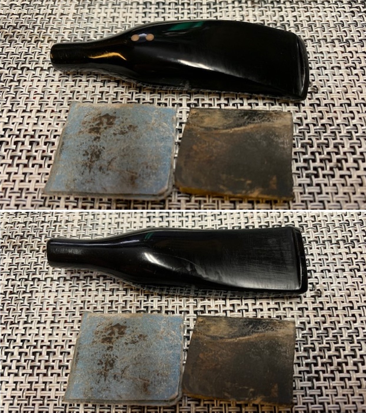 I wiped down the bowl with acetone to remove the shiny coat. It barely broke through the coat. I wiped it down repeatedly and then moved on to the micromesh pads.