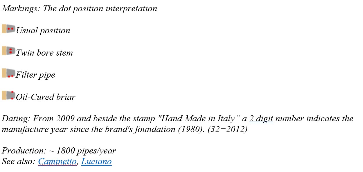 In 1890 Turildo Barontini opened a factory for the production of briar. In 1925 his son Bruno began to produce the first pipes. Cesare Barontini, son of Bruno, started direction of the factory in 1955, and still runs it together with his daughters Barbara and Silvia.