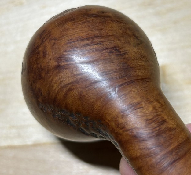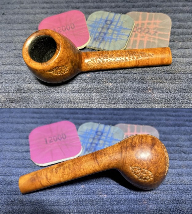 I took a solid wooden sphere, wrapped a piece of 220-grit sandpaper around it, and sanded the inner side of the chamber. This achieved two things: first, it removed some of the burn marks on the inner edge of the rim; and second (and more importantly), the circular shape and motion of the sphere gradually returned the edge to a perfect circle. Then, I took my entire set of Micromesh pads to finish off the sanding of the stummel.
