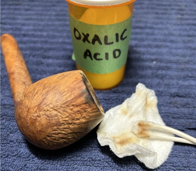 With all that done, I could address the burn on the rim. I took some oxalic acid, used several Q-tips, and rubbed and rubbed and rubbed. The burn improved quite a bit, though there are still some signs of it left.