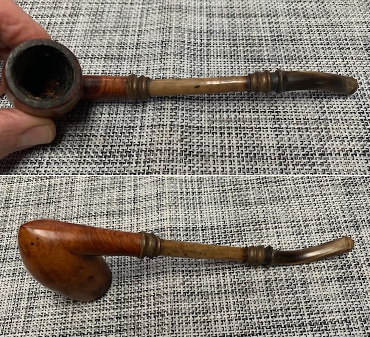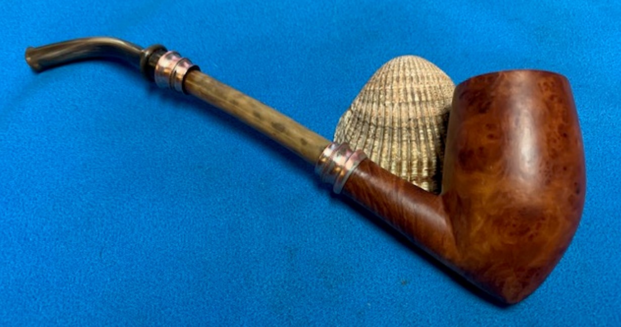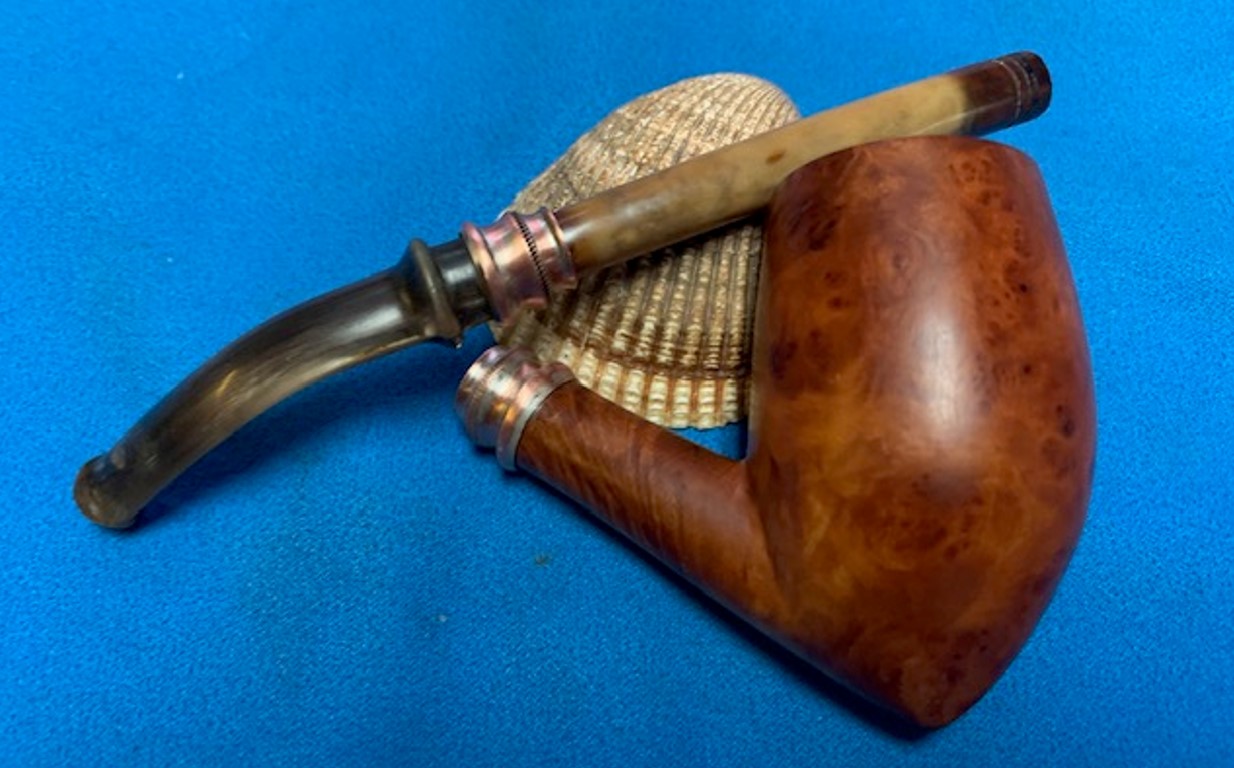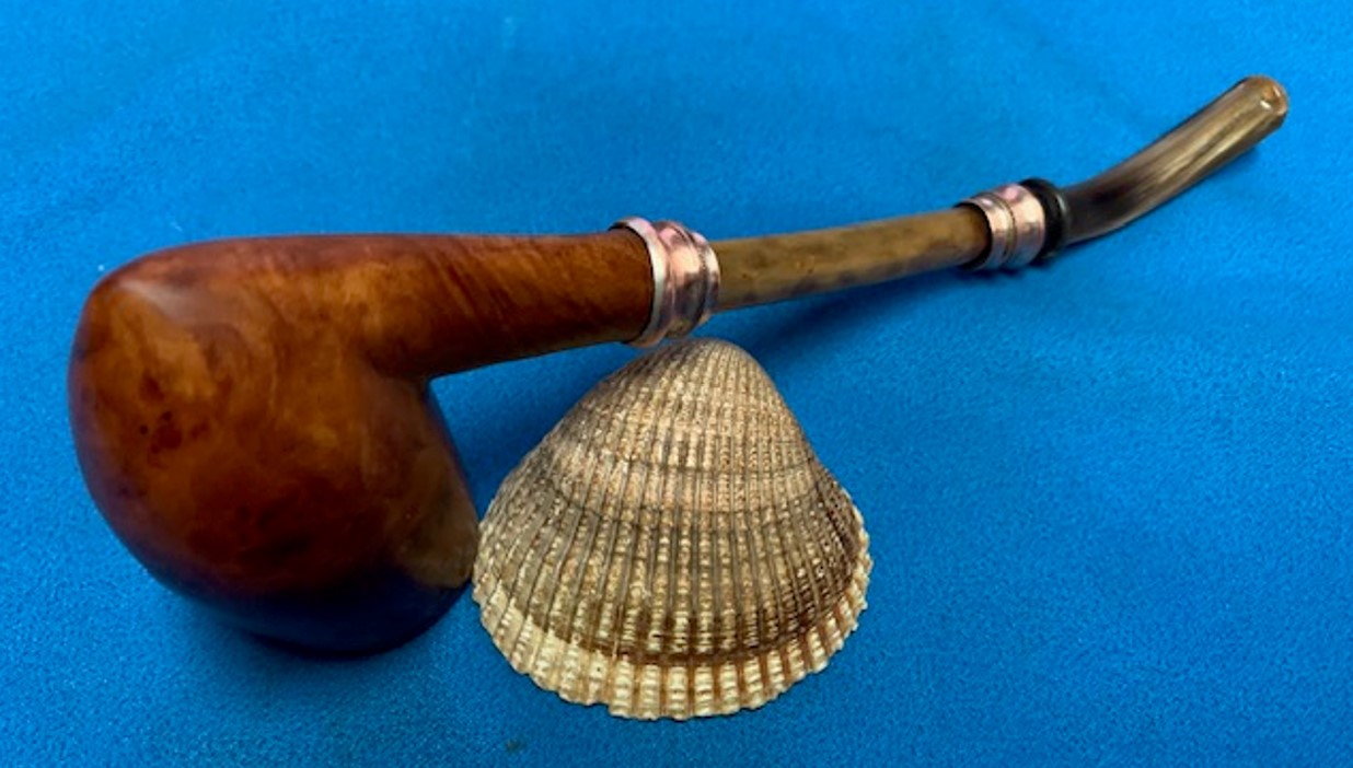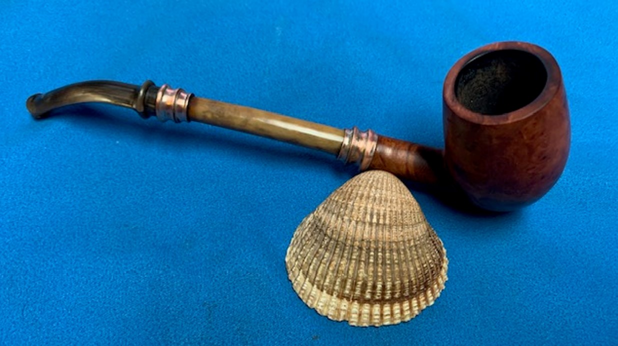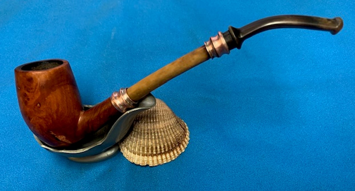 From all the input that I have gathered, the flat bottom bowl, the stamping, the sterling silver adornments, the bone shank extension and horn stem, I can safely place this piece as being one of the first A Metz pipes from the 1858 era!