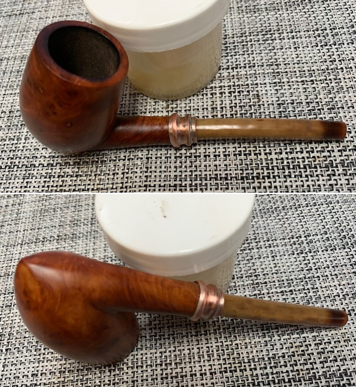 As we had planned, in celebration of the completion of the restoration together we smoked 3 unbelievable vintage pipes with albatross shank extensions and horn stems – all from the 1800s. Oh my…. We each thoughtfully packed our bowls with our choice of blends and lit up and, well…. What a treat for Paresh to share the treasure trove of pipes left to him by his grandfather. Jeff did the honor of commemorating this event with pictures. (Photo from Dal)