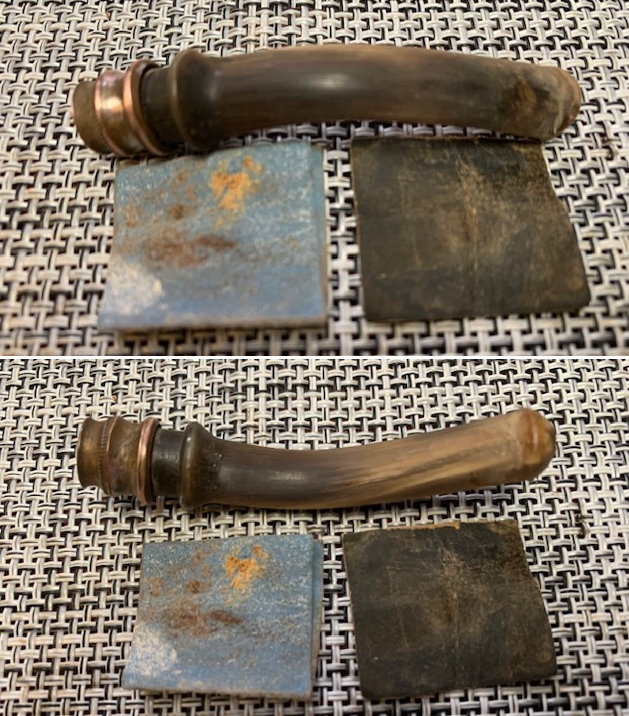 Back in 2018 I had worked with Paresh on Facetime on a First Generation Choquin A Metz. It was very different than the previous two. It had a horn stem and an albatross wing bone as a shank extension (https://rebornpipes.com/2018/11/17/a-challenging-restoration-of-vintage-era-first-choquin-a-metz/). Given that information, I knew that I was looking at another First Generation A Metz. It had the horn stem and the albatross wing bone shank extension. The pipe on my worktable brings back a lot of fond memories for me. I remember walking through the restoration of Paresh’s Grandfather’s A Metz Origine with him. We chatted on Facetime many times during this particular restoration. Paresh had determined that this pipe was very old. I quote below and also have included a photo: