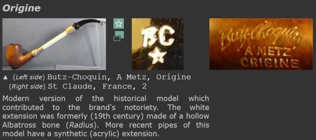 I turned to Pipephil (www.pipephil.eu/logos/en/logo-butzchoquin.html) to get a bit of background on the brand and found this write up and photo of the second or the modern version of the Origine pipe. I have included a screen capture of the pertinent section below. (Interestingly the notes below the photo speak of the one that I have in hand.)