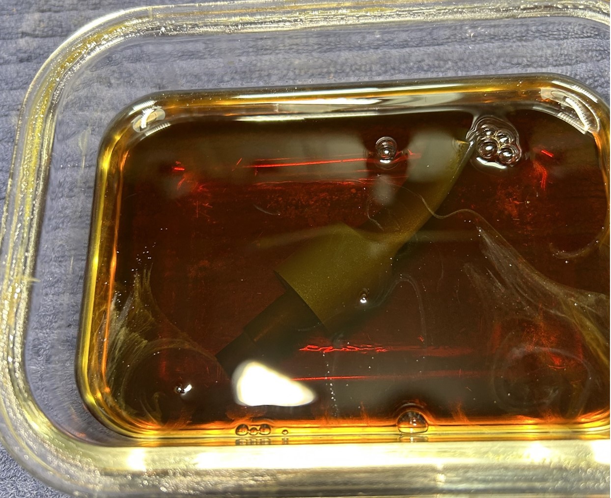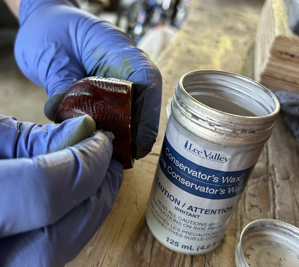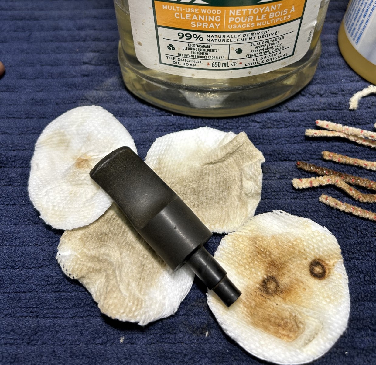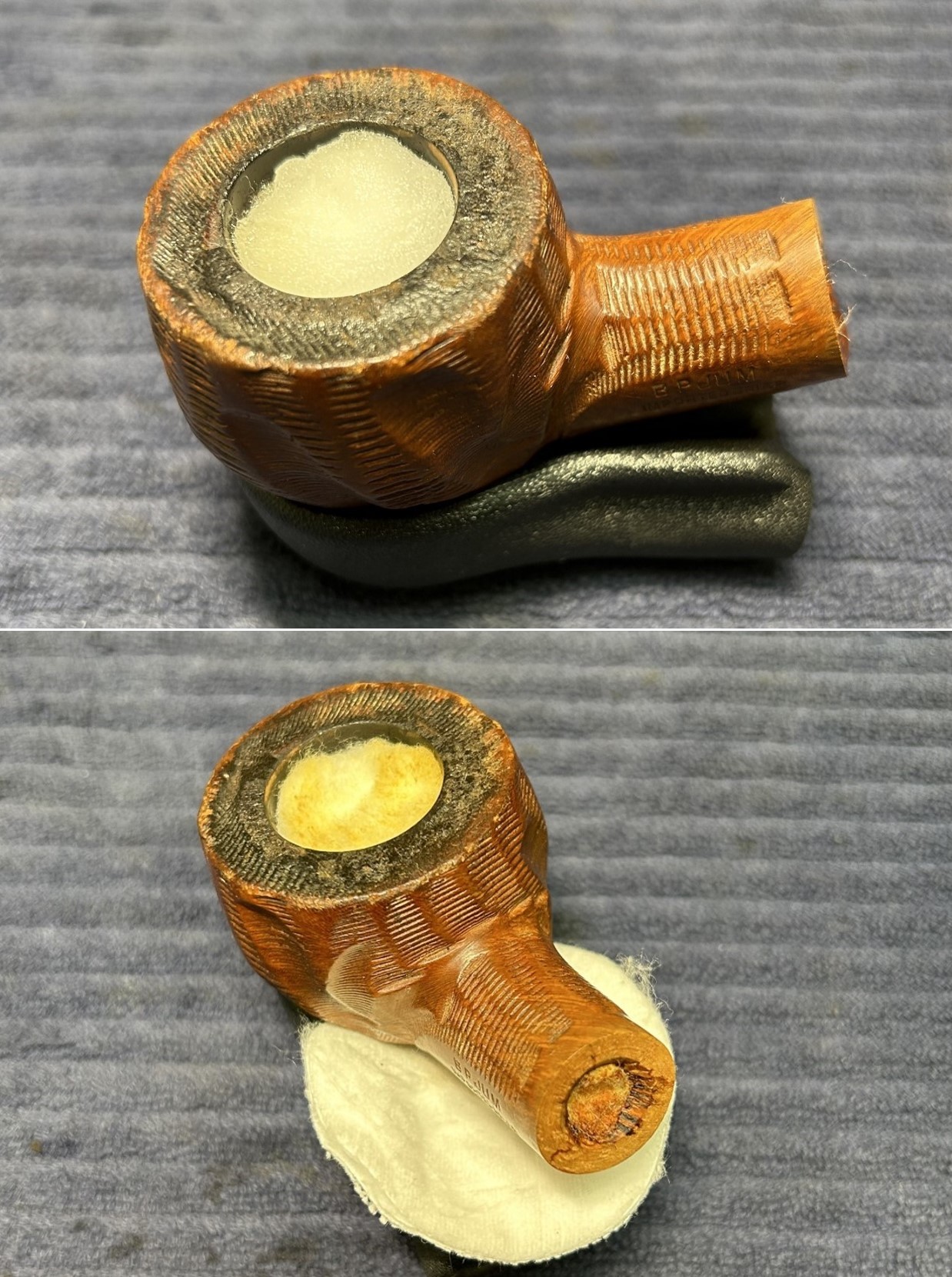 This pipe had been well-loved and well-smoked, as it arrived with some marks and general wear. The stem was dirty and had lots of dents and tooth marks. Most of the stummel was in decent shape, but the rim was pretty nasty – the were burns and lava, and the rustication grooves were full of gunk.I took up the stem and cleaned it off with Murphy’s Oil Soap. It was quite dirty and needed some scrubbing. Following that, I used pipe cleaners and lemon-infused isopropyl alcohol to clean out the internals of the stem. As you can see, there was much muck to be removed!Next, I wiped down the stem with some SoftScrub cleanser and then put the stem in my container of deoxidizing fluid. This works to draw the oxidation to the surface of the stem, so that it can be cleaned off again with more SoftScrub.With the stem nice and clean, I needed to address the damage to the stem. To achieve this, I applied a type of black cyanoacrylate adhesive (impregnated with carbon and rubber) to the damaged area. I sprayed these areas with an accelerant to cure the adhesive immediately.I then had to shape these repairs so that they would look great! I began by taking a needle file and shaping the hardened adhesive. Continuing, I used 200- and 400-grit sandpapers on the repairs to smooth them out. I finished up by using all nine of my MicroMesh pads to sand the entire stem. I also used some pipe stem oil to assist with the sanding and protect the vulcanite.Having put aside the stem, I moved on to the charming, chunky stummel. First on the agenda was to ream out the bowl, as it was full of cake. The PipNet reamer made short work of this, and I followed up by sanding the walls down with some 220-grit sandpaper attached to a wooden dowel. This revealed a tiny bit of damage to interior wall – but this would be easily fixed.Next on the list, I thoroughly cleaned out the shank. Using a combination of Q-tips and pipe cleaners dipped in lemon-infused isopropyl alcohol, I removed all the awful filth in there. The photo shows a mere portion of the cotton used. As the girls in the 80s used to say, grody to the max!I always like to ameliorate the cleaning of the stummel by performing a “de-ghosting” on the stummel. I placed some cotton balls in the bowl and the mortise of the shank, then saturated them with straight isopropyl alcohol. I let this sit overnight while the oils and tars (and evil spirits) leeched into the cotton.I broke out the Murphy’s again and wiped down the outside with some cotton rounds. Once I felt the outside was clean, I then took out my two brushes and castile soap and washed both the inside and outside. The internals were lovely and clean after that – but there were still some issues on that rim.Even though I’d used both a toothbrush and a wire brush on the rim, there was still some filth to be dealt with – not to mention some burning. I began by “topping” the pipe – in other words, I placed the top of the pipe, level and flat, on a piece of 220-grit sandpaper and gently ground it down to smooth and even out the rim. The rim still required a bit more beautification. I took a small piece of sandpaper and evened out some rough parts that topping wasn’t able to address.I then went “next level” insane. I took a dental tool and individually excavated each groove on the rim to remove the crud. It took awhile, but the results were worth it.In order to address the burns, I dissolved some oxalic acid crystals in some hot water. Then, taking a Q-tip and tipping it in the acid, I rubbed and rubbed and rubbed until it removed most of the burning that was there. It didn’t all come off (it rarely does), but was much improved.Once I was satisfied with that, the finishing sanding was next, so I took all nine of my MicroMesh pads and sanded the whole stummel until it was super-smooth and handsome.The pipe had benefitted from a lot of work, but this wore out the colour of the wood. I decided to restain the pipe. First, I brought out my heat gun and spent a couple of minutes thoroughly heating the wood, so it would be as receptive as possible to the stain. I wanted the stain to penetrate well into the wood, to give the best results. I applied Fiebing’s Light Brown Leather Dye with a cotton dauber. I flamed it with my Bic lighter, let it set, then coated it again with dye, flamed it again, and let that set too. I decided to let the pipe sit overnight. This dye is alcohol-based, so I used isopropyl alcohol to wipe down the pipe and remove excess stain. I am very happy with the results.Earlier, I referred to a little hairline crack emanating from the draught hole. Steve recommended repairing it some pipe mud. This is made by mixing cigar ash (not pipe ash) with the merest bit of water to create a paste. I then applied the paste with a tiny spatula and let it set until dry. I then gently sanded it down.Later, I added some Before & After Restoration Balm to the stummel. This does good things to wood, enhances the grain, and brings out some lustre.Then it was off for a trip to the buffer. I applied a few coats of Conservator’s Wax and the pipe really popped. The lovely shine made the wood very attractive. This is a very handsome pipe and will provide many years of smoking pleasure.This BP Jum is much improved and is ready to be enjoyed again by the next owner. I am pleased to announce that this pipe is for sale! If you are interested in acquiring it for your collection, please have a look in the American pipe section of the store here on Steve’s website. You can also email me directly at kenneth@knightsofthepipe.com. The approximate dimensions of the pipe are as follows: length 5⅜ in. (137 mm); height 1⅝ in. (41 mm); bowl diameter 1⅞ in. (48 mm); chamber diameter ⅞ in. (24 mm). The weight of the pipe is 2⅛ oz. (61 g). I hope you enjoyed reading the story of this pipe’s restoration as much as I did restoring it. If you are interested in more of my work, please follow me here on Stev