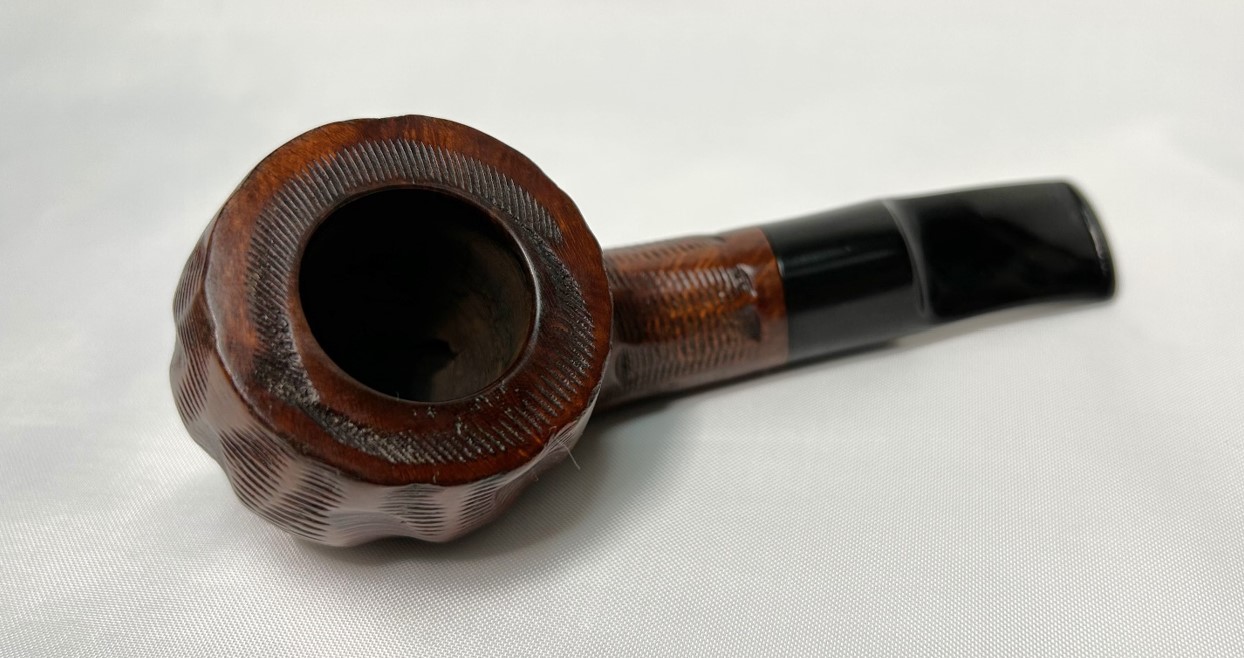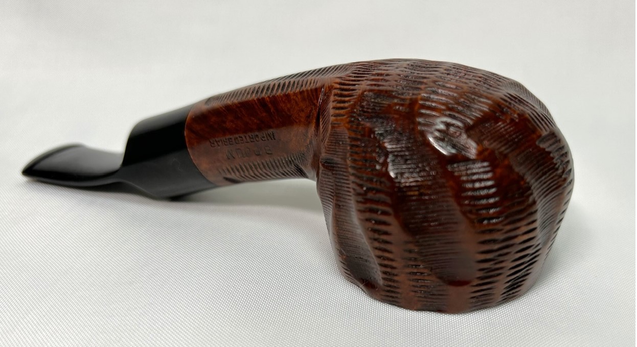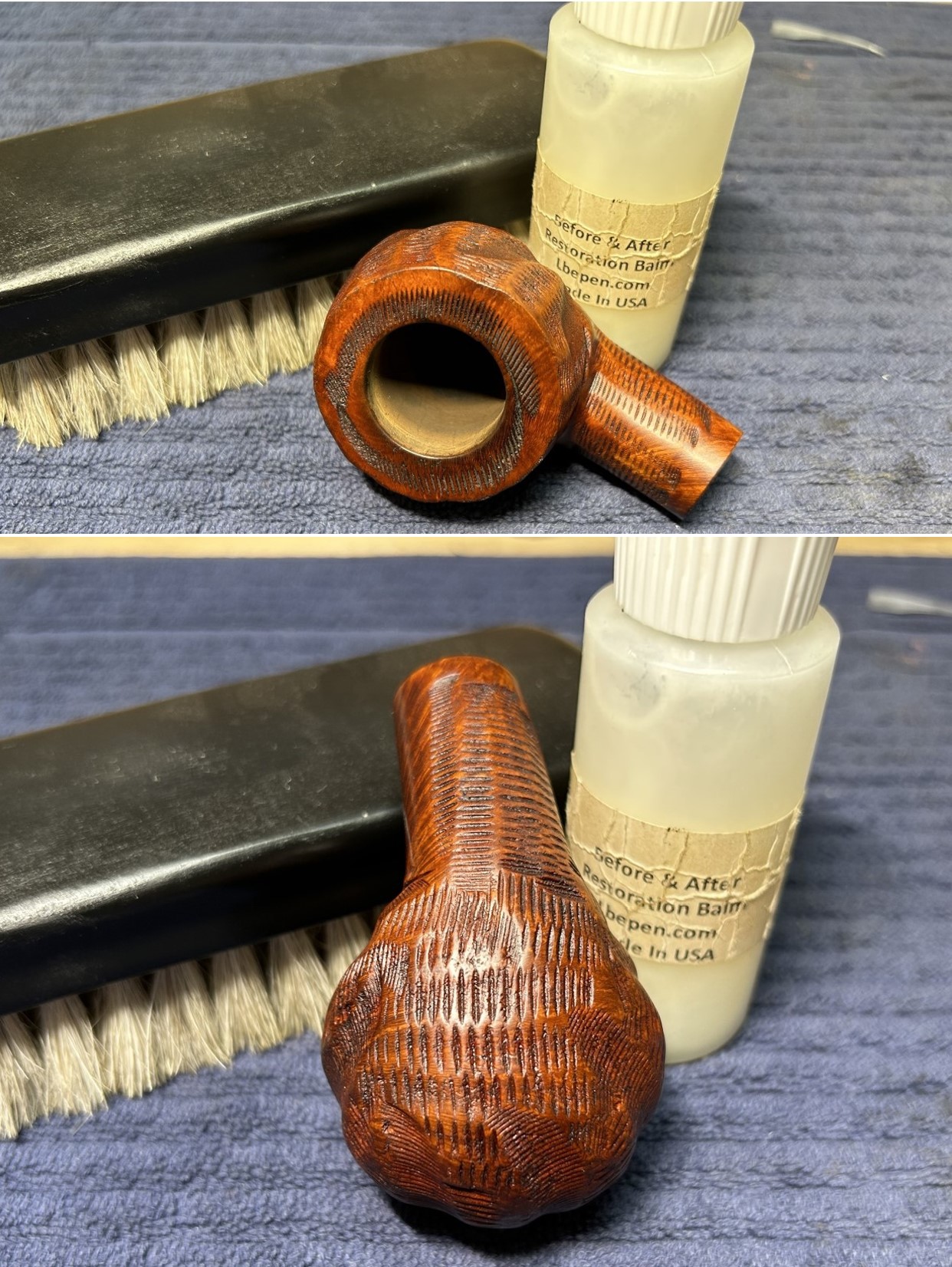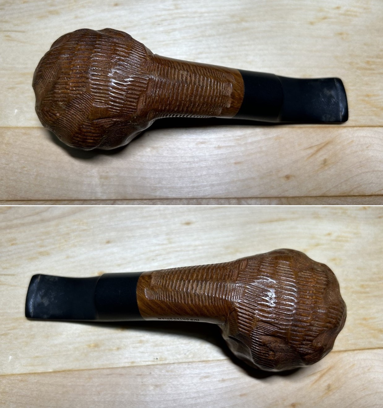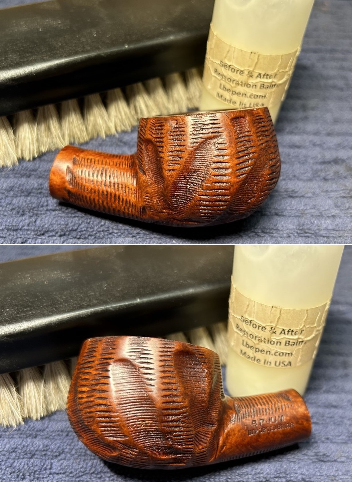 Next on the chopping block is a robust, rugged, rusticated pipe which I acquired in a lot of pipes from a gentleman living on Vancouver Island. He had quite an assortment of pipes and they ranged from the ridiculous to the sublime. This is not a Custom-Bilt – it is a BP Jum. They could easily be mistaken for one another.This is a very handsome pipe and promises to be a great smoker. It’s a bent pot (or a “War Club”, as Steve calls it), with a vulcanite, wide saddle stem. And what a wonderful rustication on this one! On the left side of the shank, the markings read BP Jum [over] Imported Briar. These are the only markings.The history of BP Jum, like many pipes of the same era, is shrouded in some mystery. The brand name has no mention on either Pipedia or Pipephil. Some pipe folks have proposed that BP Jum pipes are, in fact, Custom-Bilt seconds, but there is no direct evidence to support this. In previous restorations that Steve has done, he wrote the following: “There was a lot of conjecture as to whether the brand was made by Tracy Mincer of Custombilt fame. There is no definitive proof other than the common shapes, sizes and look of the pipes. Bill Unger, of Custombilt fame and author of a history of the brand, mentions BP Jum but cannot definitively connect the two. So the maker remains a mystery that is still unsolved.”