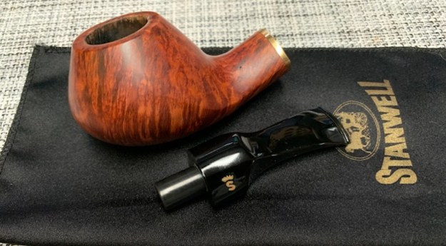 This Stanwell Made in Denmark Boa 198 Diplomat with an acrylic saddle stem is a great looking pipe now that it has been restored. The beautiful finish really highlights the grain and the polished finish is stunning. The brass band/spacer is also a great addition. I put the stem back on the bowl and carefully buffed the pipe with Blue Diamond on the buffing wheel. I gave the bowl and the stem multiple coats of carnauba wax on the buffing wheel and followed that by buffing the entire pipe with a clean buffing pad. I hand buffed the pipe with a microfiber cloth to deepen the shine. The finished Stanwell Boa 198 Diplomat fits nicely in the hand and feels great. Give the finished pipe a look in the photos below. The dimensions of the pipe are Length: 5 ½ inches, Height: 1 ¾ inches, Outside diameter of the bowl: 1 ¼ inches, Chamber diameter: ¾ of an inch. The weight of the pipe is 75 grams /2.65 ounces. I will be adding the pipe to the Danish Pipe Makers Section of the rebornpipes store. If you are interested in purchasing this pipe send me a message or an email. Thanks for reading this blog and my reflections on the pipe while I worked on it.