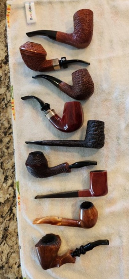 A few weeks ago I was contacted from a fellow in Montana who was selling his pipes as they had not been used for quite a few years. I asked him for a picture and he sent me the one to the left. It included the following brands (from the top to the bottom of the photo): Savinelli Autograph 5 Freehand, Mastro de Paja Ciocco 0C Bulldog, Mastro de Paja Media 1C Bent Billiard, Ser Jacopo Delecta Octagonal Bent Billiard, Caminetto Business KS118 Canadian, Radice Rind Rhodesian, Dunhill Bruyere ODA 836 Panel Billiard, Barontini Straight Grain B3 Freehand and a Ben Wade Martinique Hand Made in Denmark Freehand.