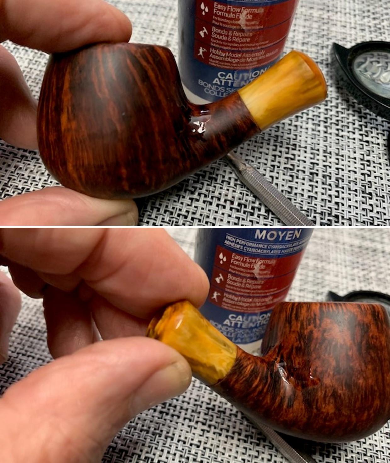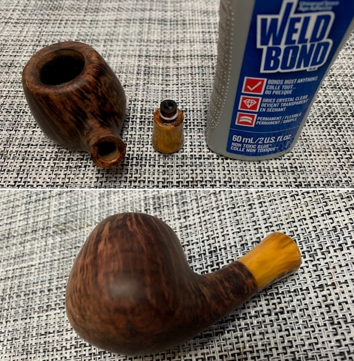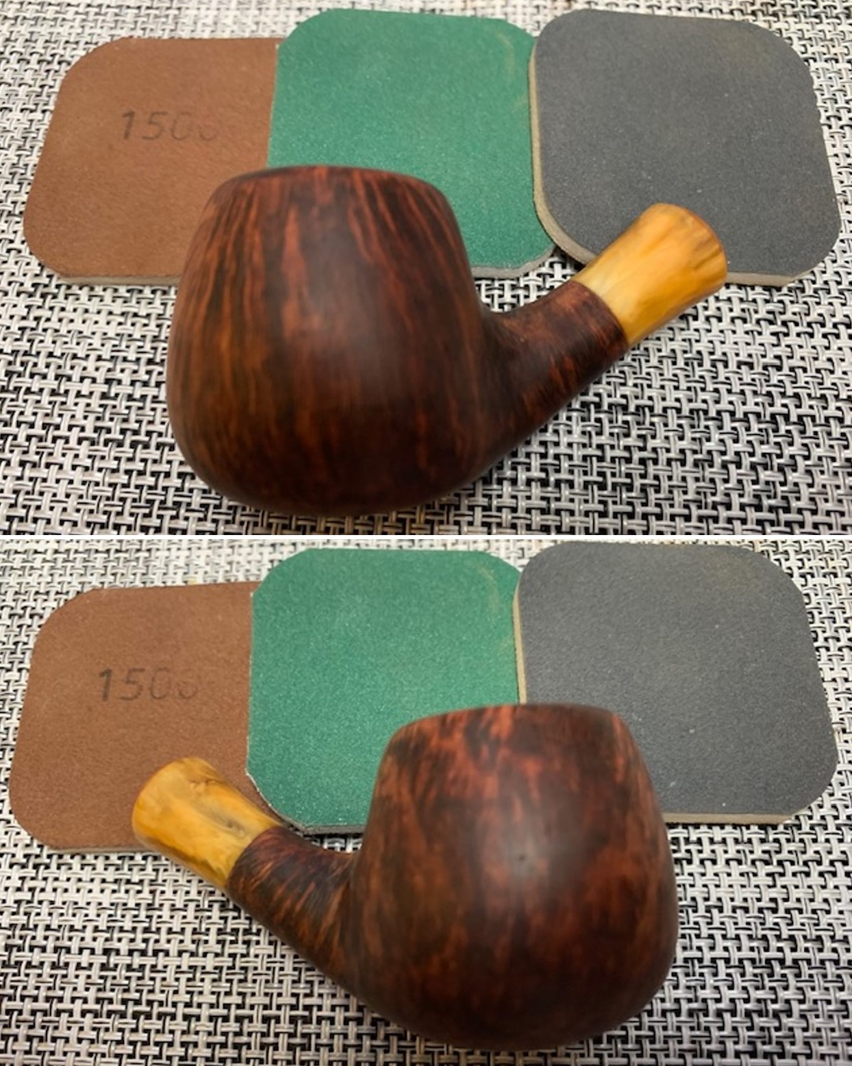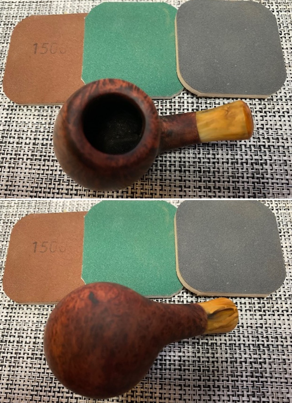 By the time I was done working on the stem refurbishment, the stummel had completely dried out. I decided to address the darkened inner rim edge by creating a slight bevel using a folded piece of 220 grit sandpaper pinched between fingers and running it along the rim edge. The rim edge looks much better at this stage.