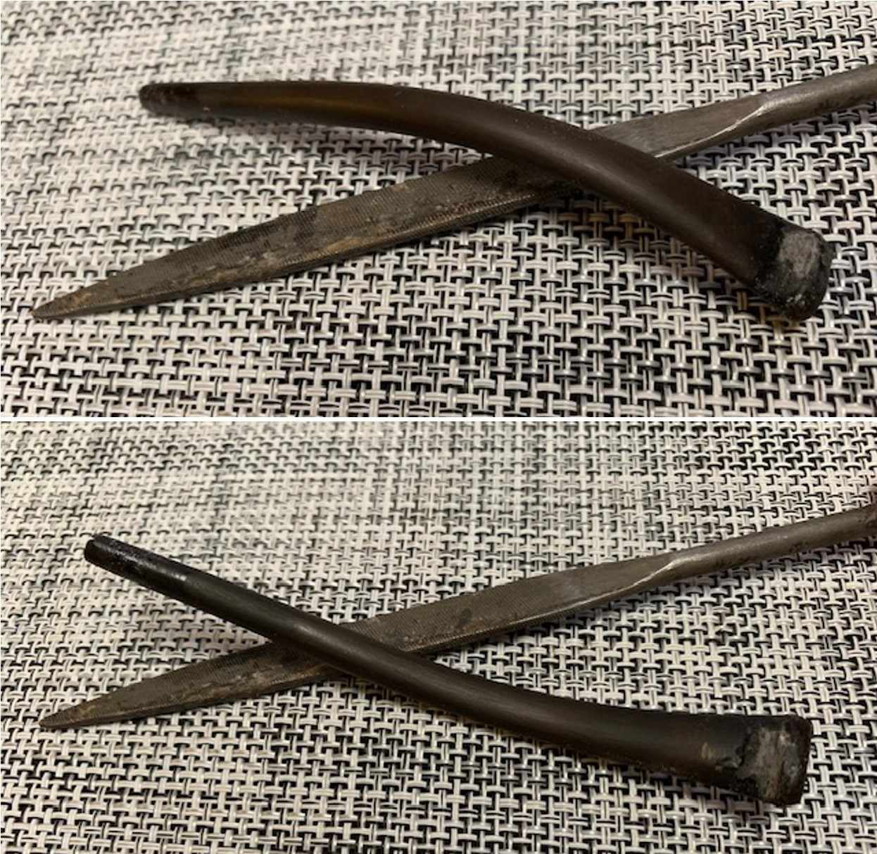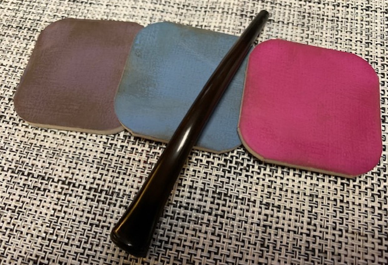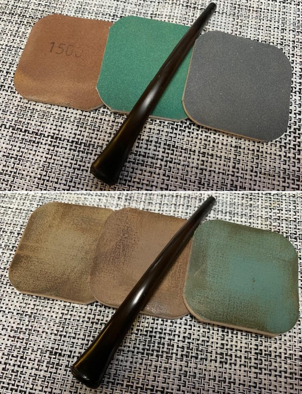 While the stummel was set aside to dry out, I worked on the stem. Using a flat head needle file, I lightly sand the inner edge of the buttons on either surface to a crisp sharpness. I further sand the entire bite zone with a folded piece of 220 grit sandpaper. This helps to even out the minor tooth chatter and also reduce the filing marks left behind by the needle file. The sanding marks will be further addressed during the sanding and polishing process.