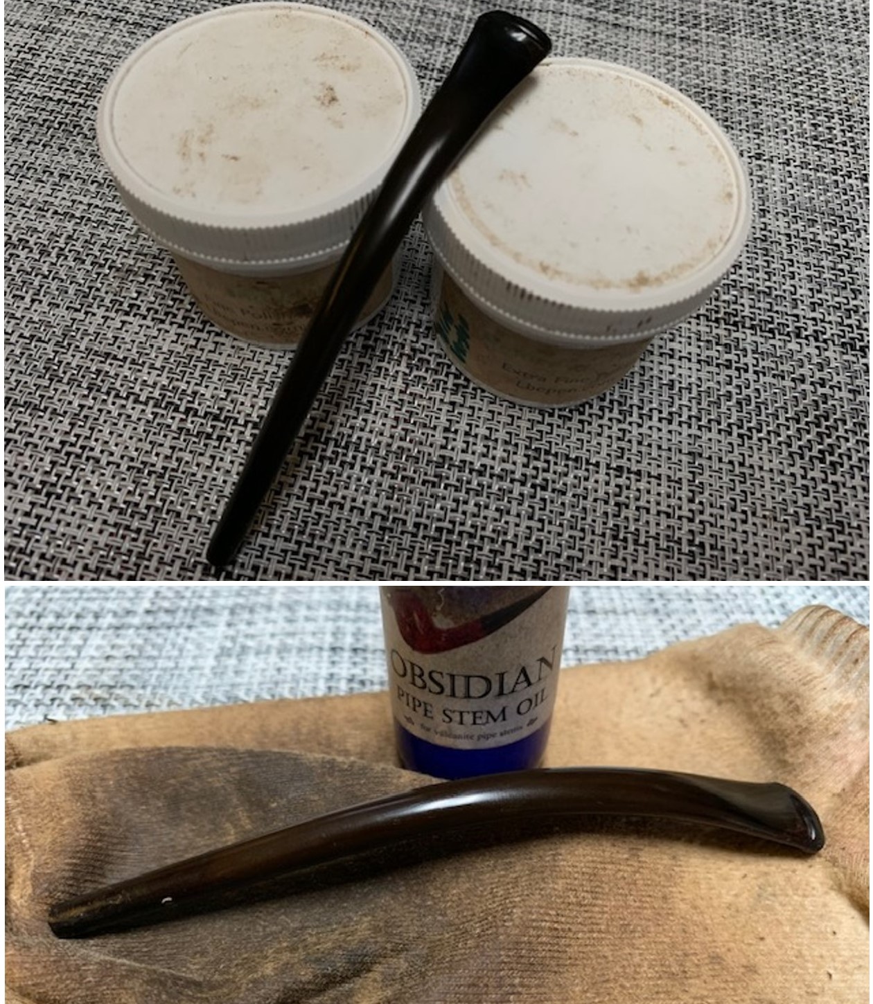 While the chamber was soaking in the salt and alcohol bath, I worked the stem, starting with cleaning the internals of the stem using thin shank brush and anti oil dish washing soap. I scrubbed the tenon end and the horizontal slot with soap and Scotch Brite pad till clean. Once the stem internals were clean, I ran a couple of pipe cleaners through the stem airway to get rid of any remaining soap as well as to dry it out.