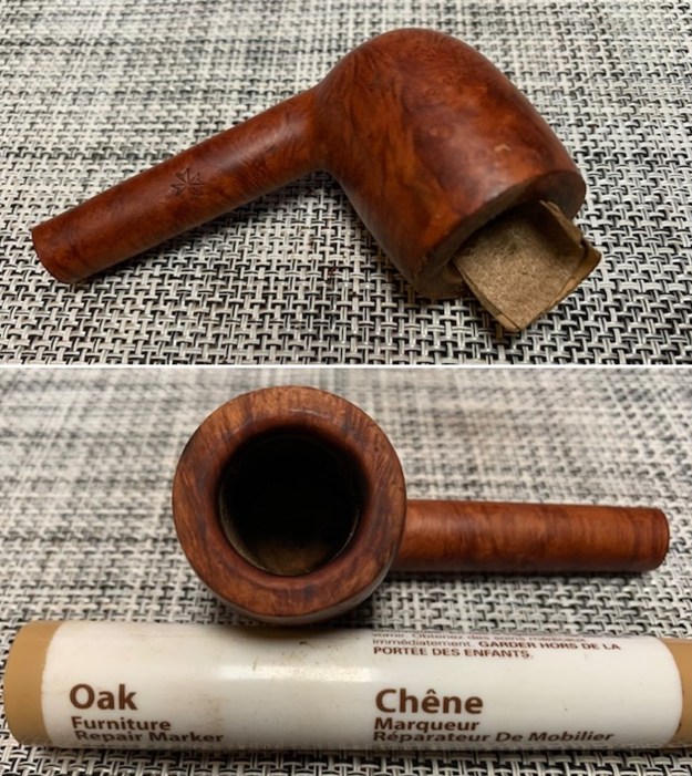I decided to address the damage to the front rim top and inner edge of the bowl first. I used a folded piece of 220 grit sandpaper to give the inner edge of the bowl a slight bevel on the inner edge to remove burned areas and blend them into the edge. I used an Oak stain pen to stain the bevel to match the surrounding briar.