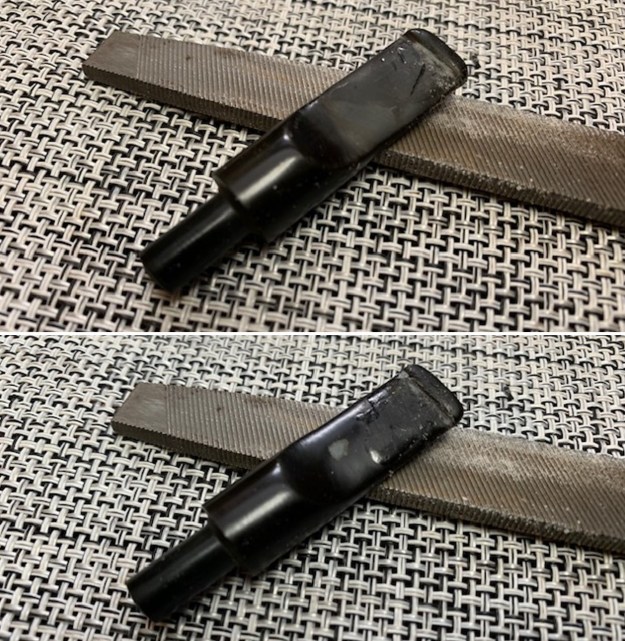 Once the repair cured. I flattened it with a file to start the blending process. I continued that process with a folded piece of 220 grit sandpaper to smooth it out. I started the polishing process with 600 grit wet dry sandpaper. It was looking much better and the bite through was gone.