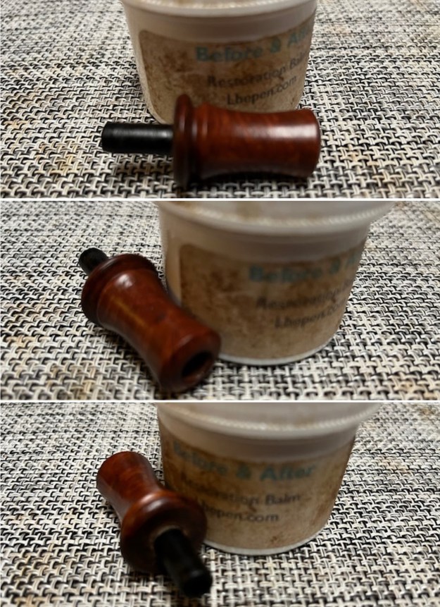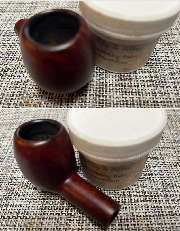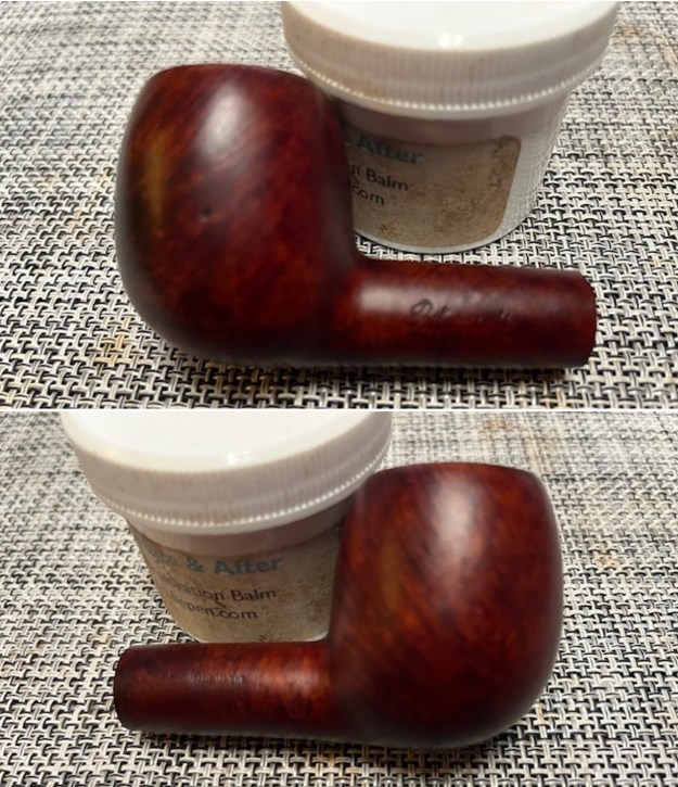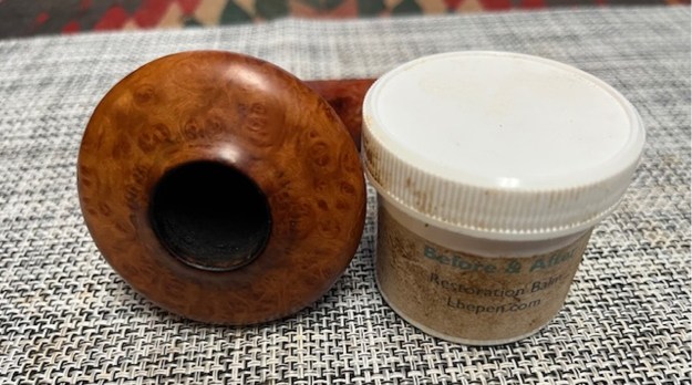 I worked some Before & After Restoration Balm into the surface of the briar with my fingertips to clean, enliven and protect the briar. I let the balm sit for 15 minutes and then buffed with a cotton cloth to raise the shine. The photos show the bowl at this point in the restoration process.