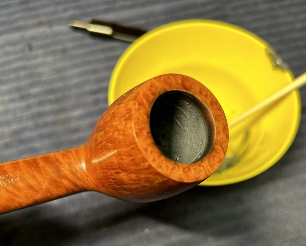 I reamed the bowl with a PipNet pipe reamer using the third cutting head to take the cake back to bare briar. I cleaned up the reaming with a Savinelli Fitsall Pipe Knife. I sanded the walls with a piece of 180 grit sandpaper wrapped around a dowel to smooth them out.