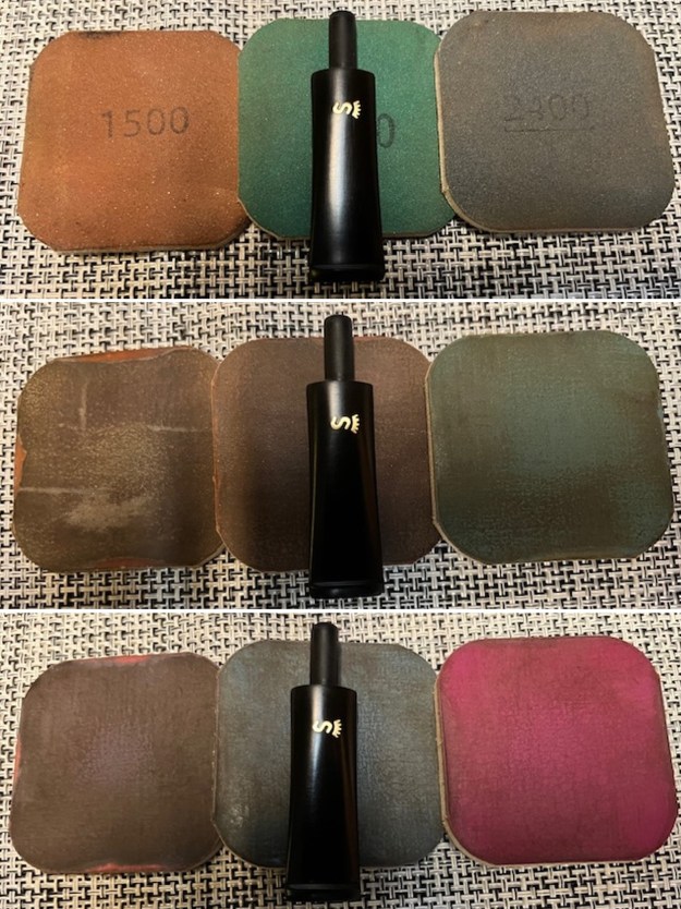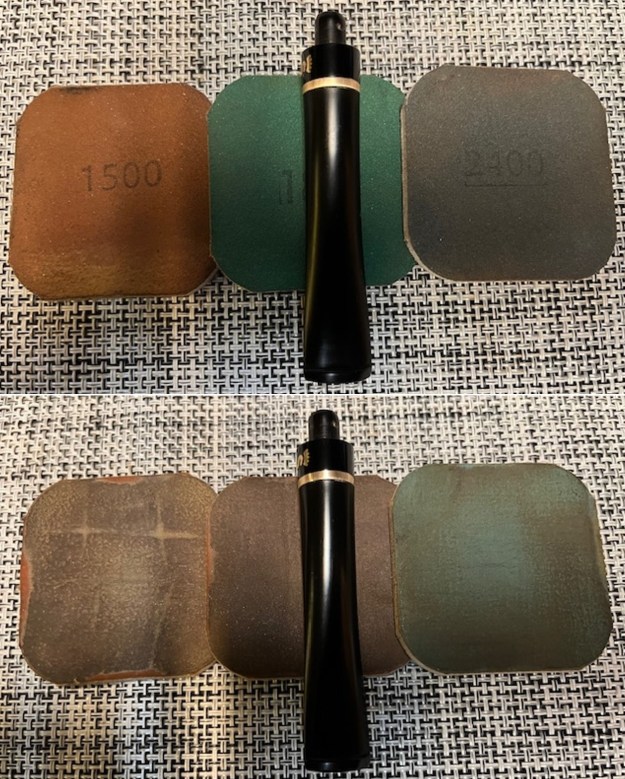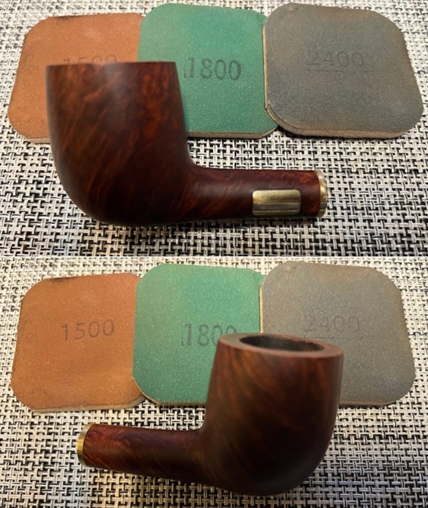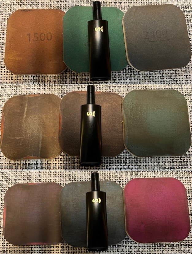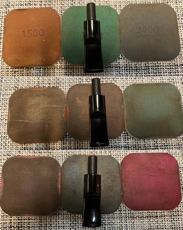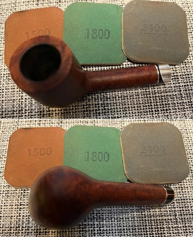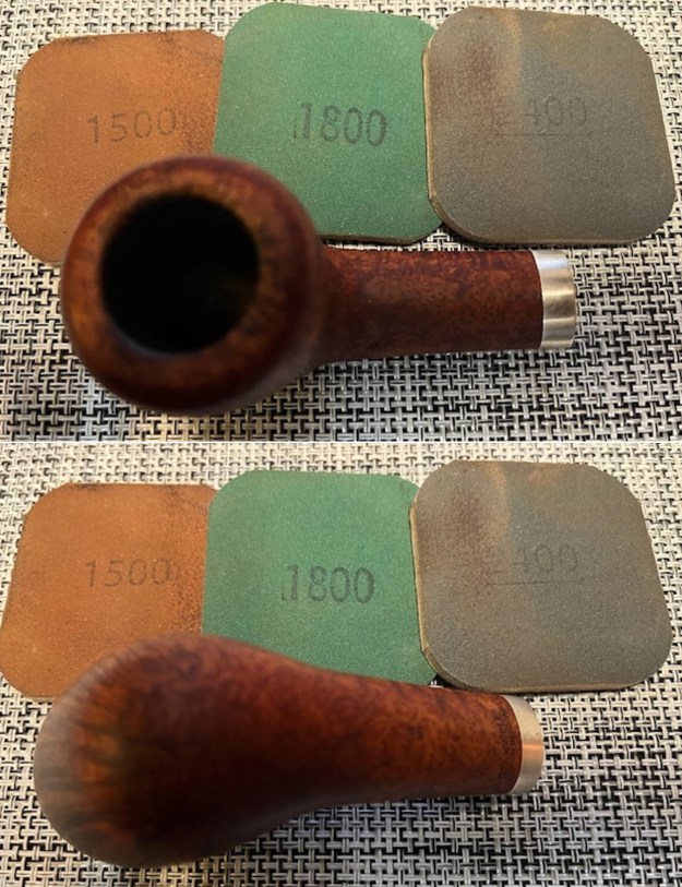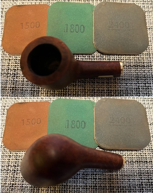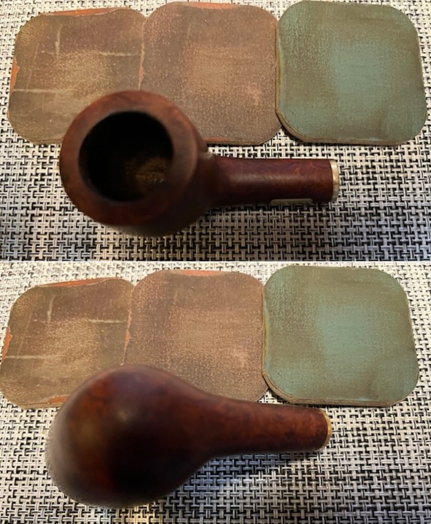 In order to safely remove the damage on the rim, I “topped” the pipe – that is to say, I gently and evenly sanded down the rim on a piece of 220-grit sandpaper. This effectively removed the damage, without altering the look of the pipe. I used some 220-grit sandpaper to remove the brown stuff on the bottom. No harm done. Then I sanded the stummel down with all nine Micromesh pads (1,500 through 12,000 grit).