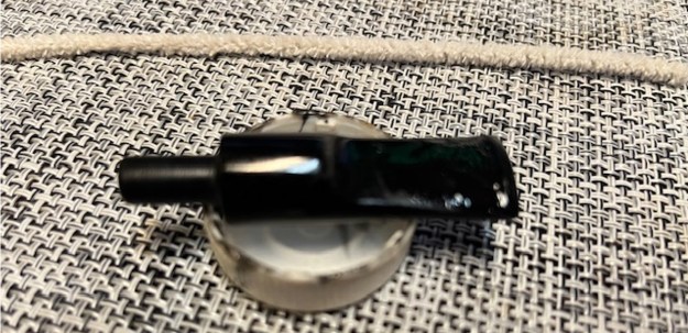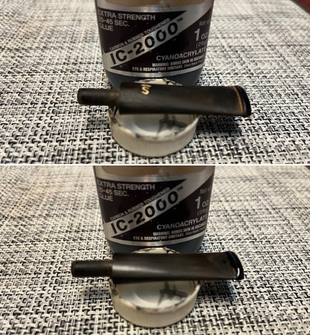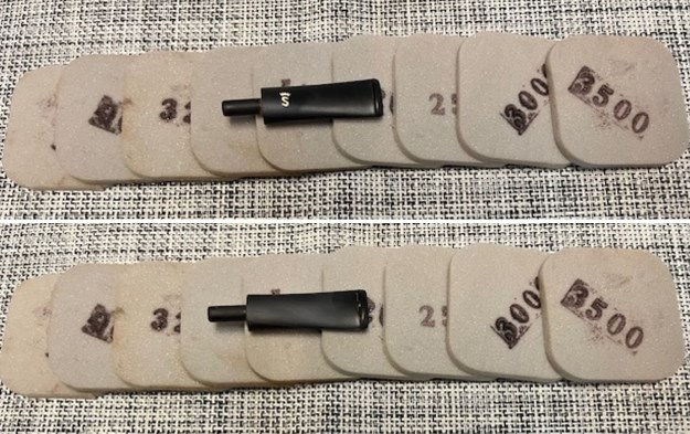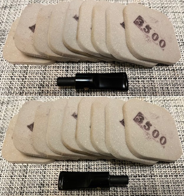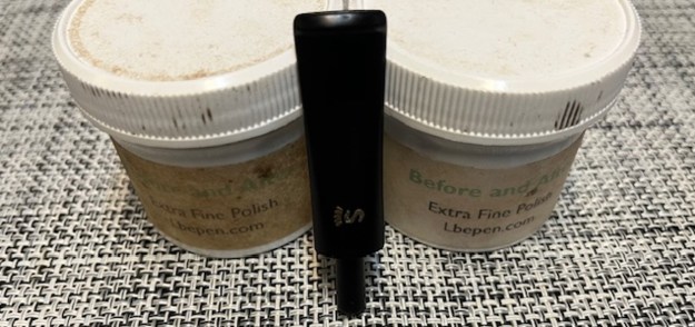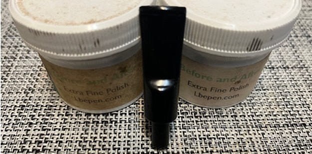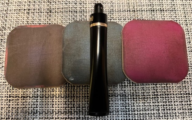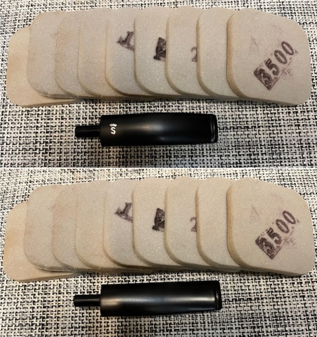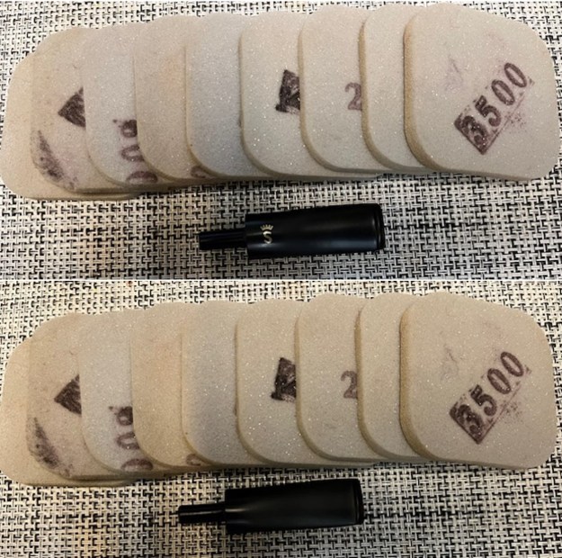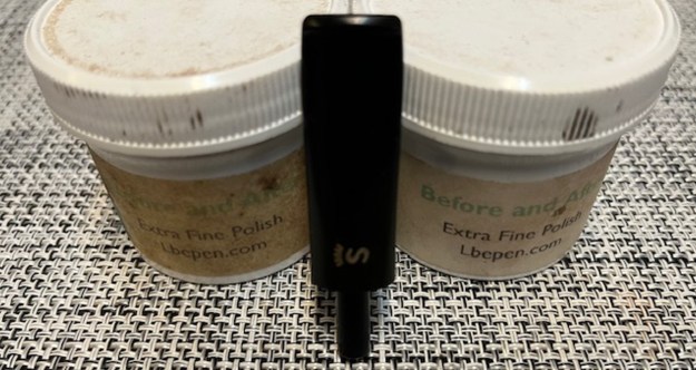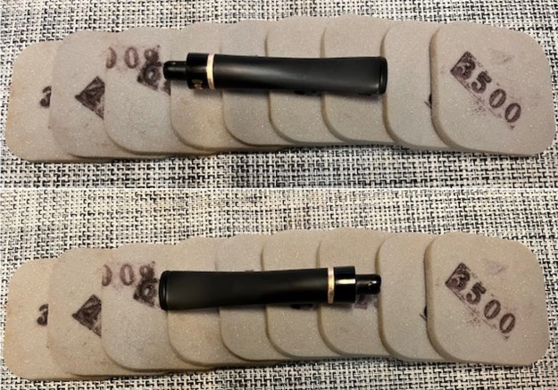 I scrubbed the stem with SoftScrub on some cotton pads. I built up the remaining marks on the stem with black cyanoacrylate adhesive and then cured it with the aid of some CA glue accelerator. I then carefully sanded the adhesive down with 220- and 400-grit sandpapers to meld seamlessly into the stem. I then used all nine Micromesh pads (1,500 through 12,000 grit) to bring out the lovely black lustre on the stem. I also used Obsidian Pipe Stem Oil in between each pad scrubbing (from 3,600 onward).