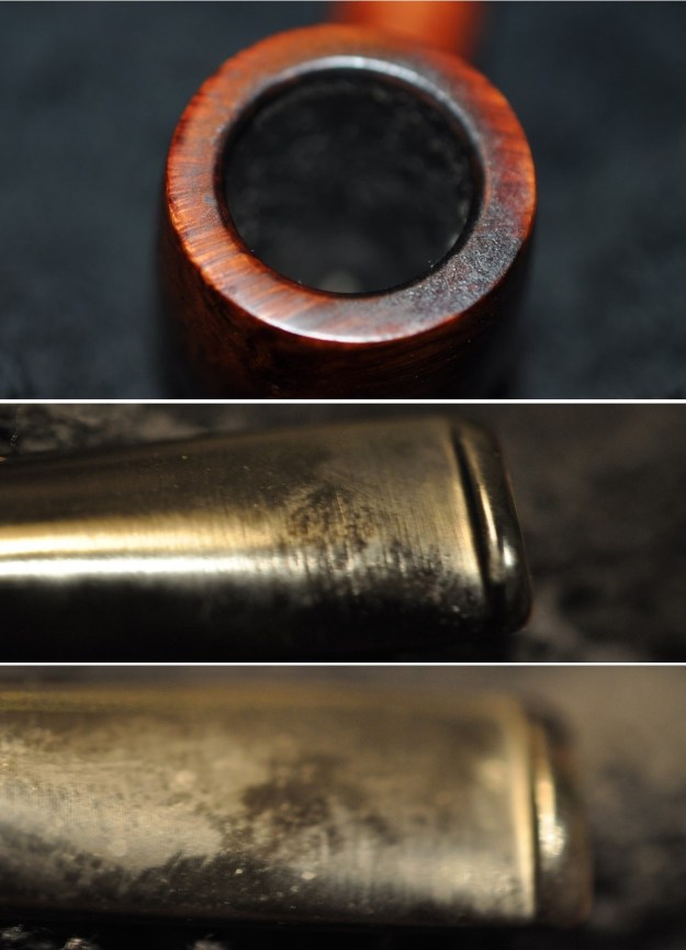 The pipe was in decent condition. It had been well-smoked, but the bowl and shank were fairly clean. The bowl had notable cake on the inside and some lava on the rim. I felt that some burning was possibly there too. On the bottom of the stummel, there was a strange, hard, brown substance – possibly wood glue or putty. Not sure what it was, but it wasn’t supposed to be there! Similarly, the stem was relatively clean – not much oxidation to speak of, and what I would describe as “typical” tooth marks on the bit. The stem was slightly bent out of shape (in the yaw and roll axes) and would need to be corrected.