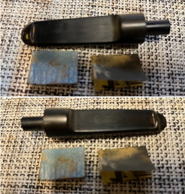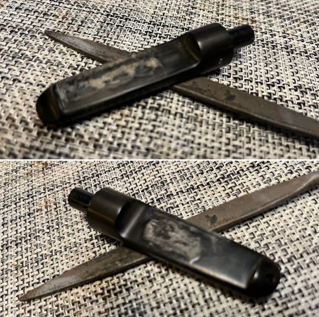 Now I knew a little bit about the pipe in my hands. Now where to begin this cleanup? I decided to begin by removing the wrinkled shellac coat. I wiped the bowl down with a cotton pad and some fingernail polish remover (acetone) to remove that top coat. It was so wrinkled on the shank I decided to remove it all.