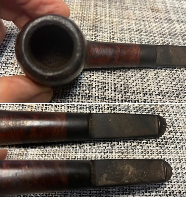 Now I examined it more closely. I will show you what I see and describe it as I go. The rim top looked very good and was clean with a slight bevel inward on the inner edge. The finish was in good condition with no wrinkles in the shellac coat on the top or down the sides of the rim cap. You can see the dark carbon coat on the bowl walls and it was smooth to the touch. Turning to look at the stem I found that it was very clean, just a little dust next to the edge of the button. There were not any tooth marks or nicks in the acrylic. It was also clean on the inside of the airway in the mortise and stem and the slot was clean in the button.