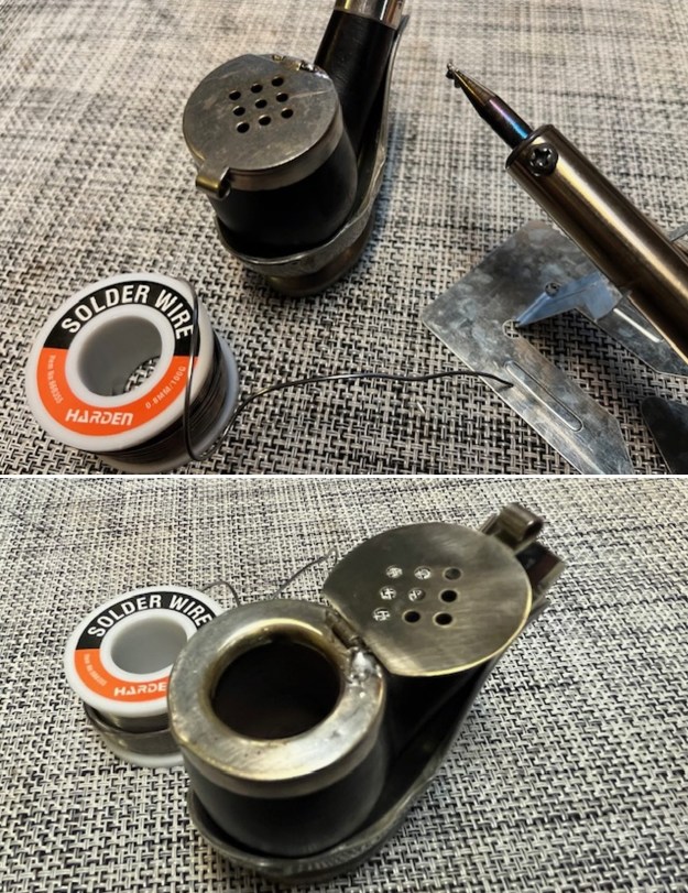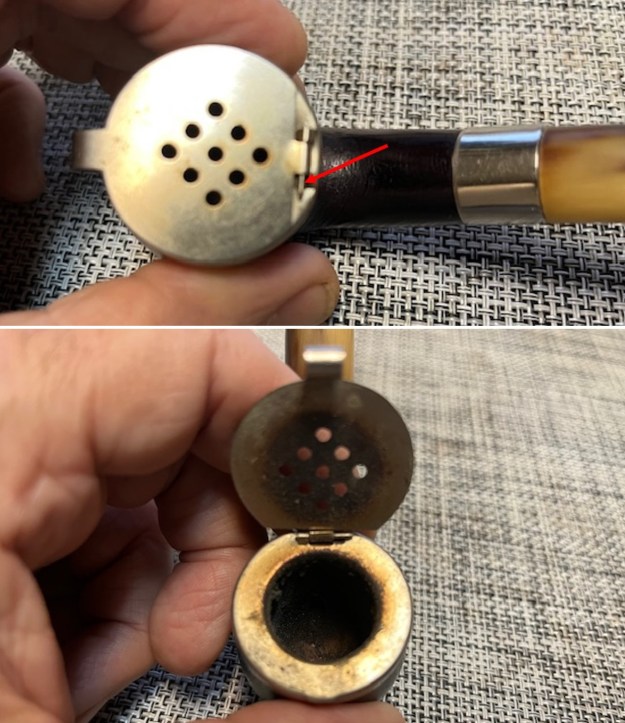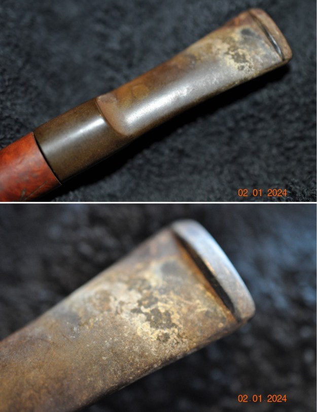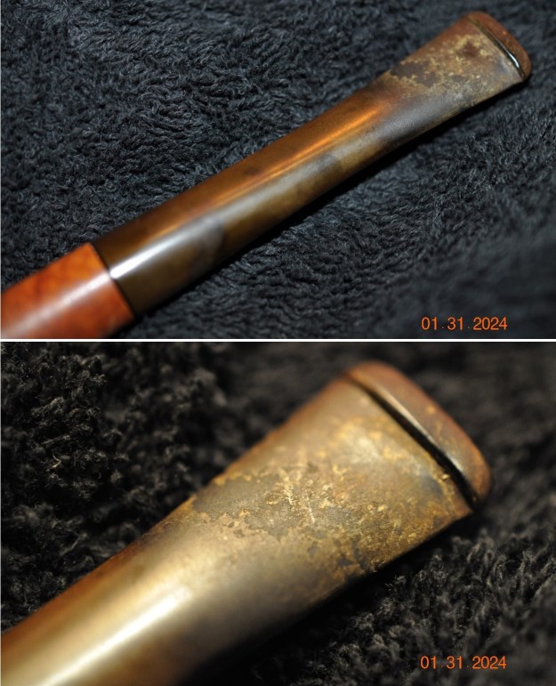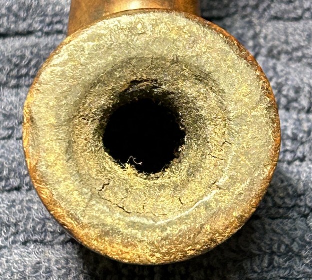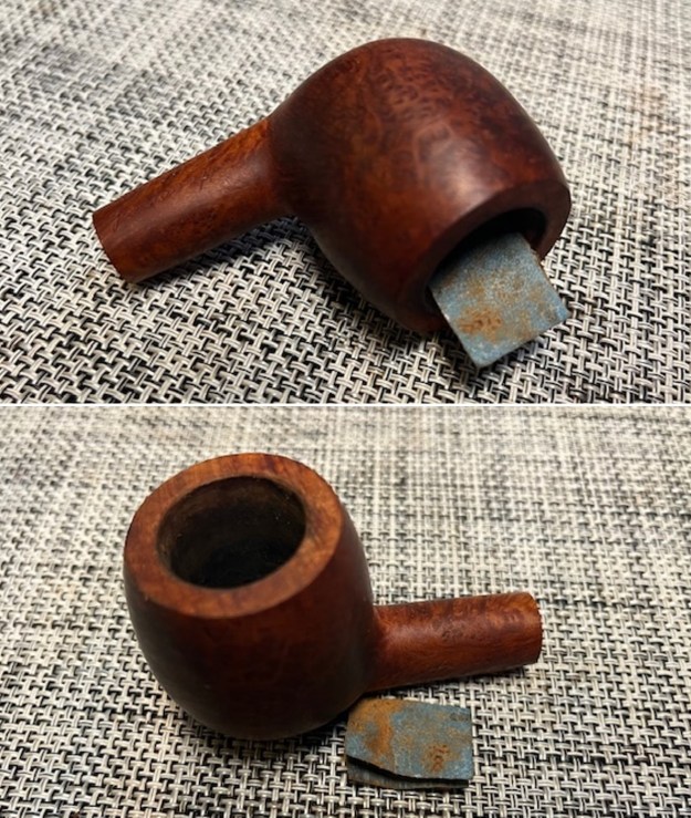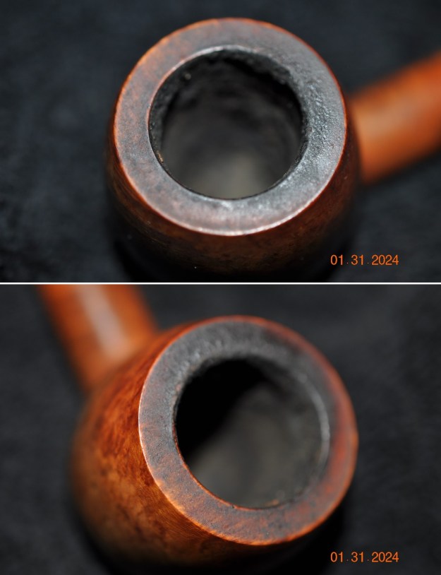 Jeff took photos show the condition of the bowl and the stem. The photos of the bowl and rim show the cake in the bowl and the lava overflowing onto the rim top. The grain on the top of the bowl and the inner and outer edge of the rim are pretty well covered in lava. It was hard to know what the edges and top really looked like until we cleaned it. The square saddle stem was oxidized, calcified and had tooth chatter and marks on both sides of the stem near the button.