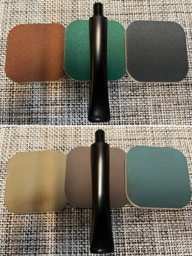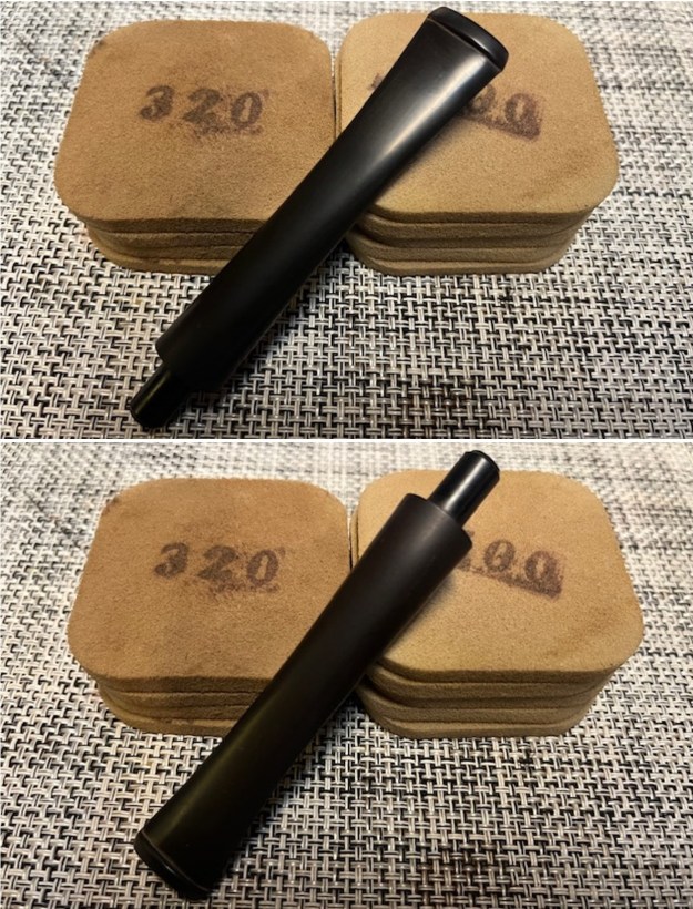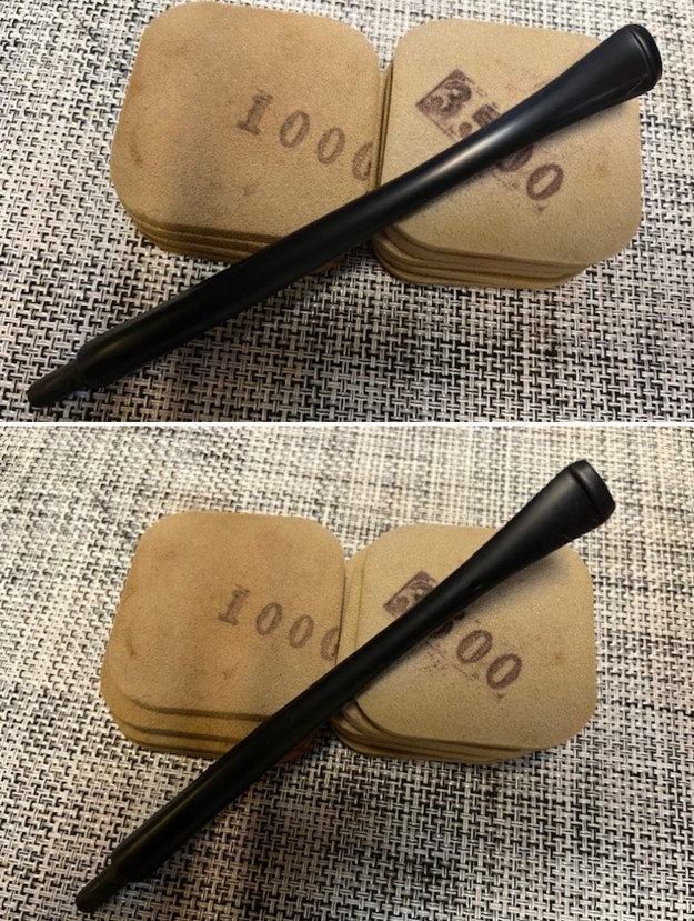 I set the bowl aside and sanded the stem with the 2 inch square 320-3500 grit sanding pads. I wiped down the stem after each sanding pad. I was able to remove the tooth marks and chatter on both sides with the pads. The stem looked very good.
