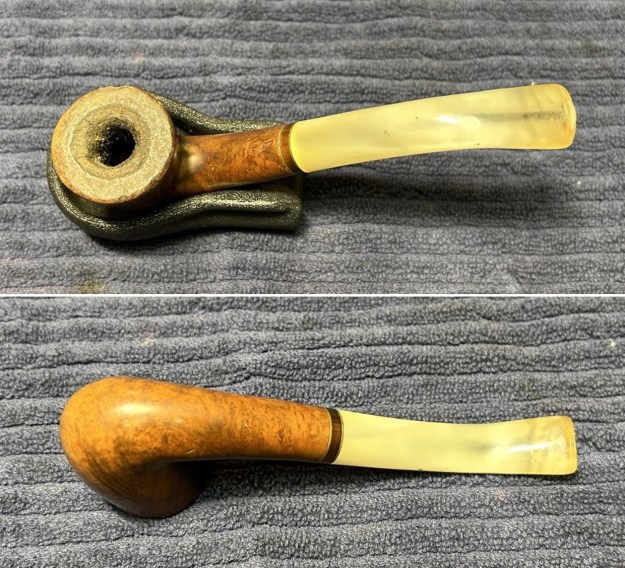 Greetings from Kamloops… hope you had a great holiday season. A while back, I picked up a KBB Palmyra on EBay (pictures attached) and I was looking into having it restored. It’s a cool little pipe with a horn stem… I think it’s 1920s era? I don’t mind fixing up estates now and again, but I’d like this one to be restored by someone with a little more know-how than me. It basically needs a thorough cleaning, minor repairs, and a repair to the hinge of the wind cap. Would you be interested in restoring it? And do you know what it might cost, offhand?