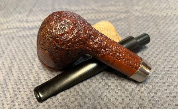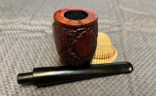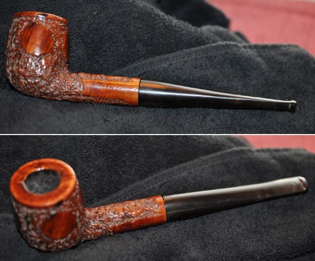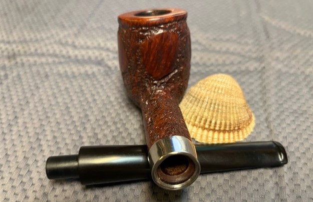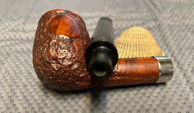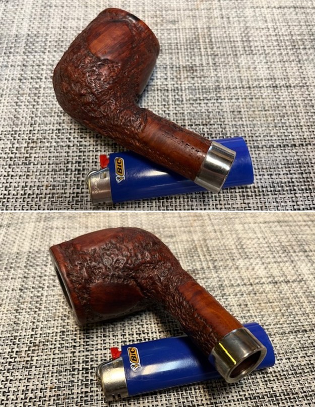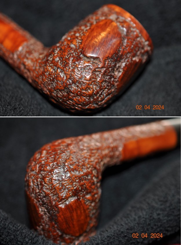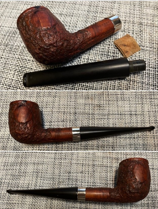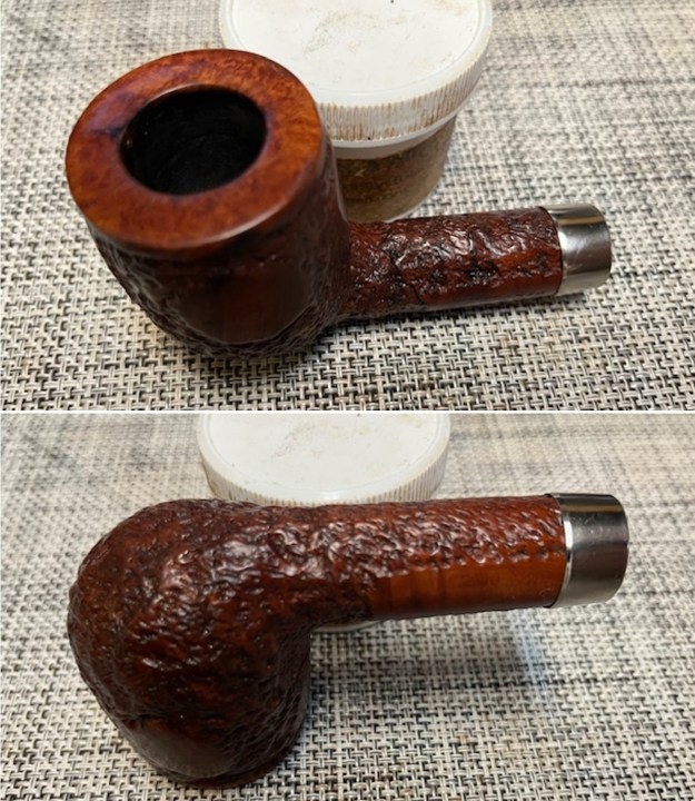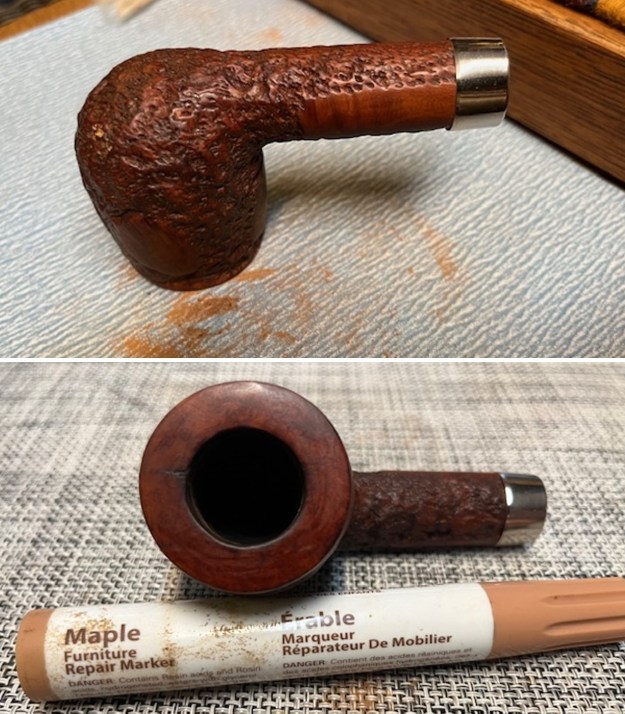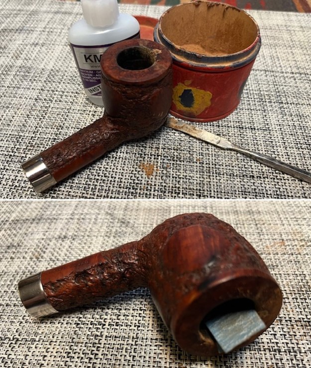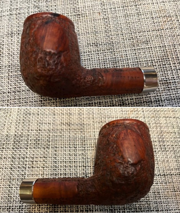 Now it was time to work on the pipe itself. When it gets to Vancouver it my turn to contribute to its restoration. Jeff did a great job cleaning the pipe on the inside and outside. He reamed the bowl with a PipNet pipe reamer and cleaned up the remnants with the Savinelli Fitsall Pipe Knife. He scrubbed out the mortise and the airway in the shank and stem with alcohol, cotton swabs and pipe cleaners. He scrubbed the exterior of the bowl with a tooth brush and Murphy’s Oil Soap to remove the dust in the rustication on the bowl and shank as well as the smooth portions. He rinsed it under running water. He dried it off with a soft cloth. Once the dust and debris were removed the finish was dull but appeared to be in excellent condition. He soaked the stem in Before & After Pipe Stem Deoxidizer and rinsed it under warm water to remove the deoxidizer gel solution. I took photos of the pipe to show its condition before I started my work on it.