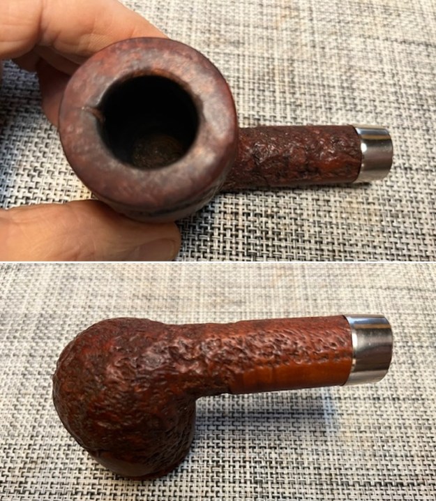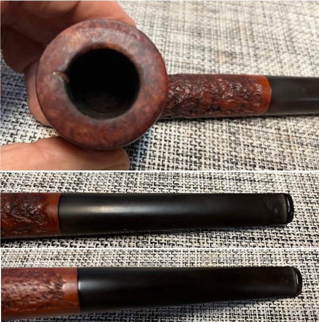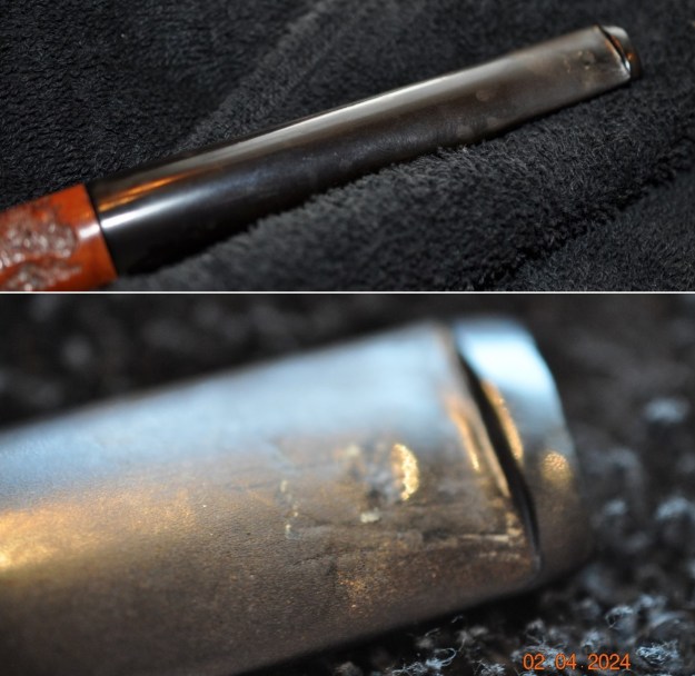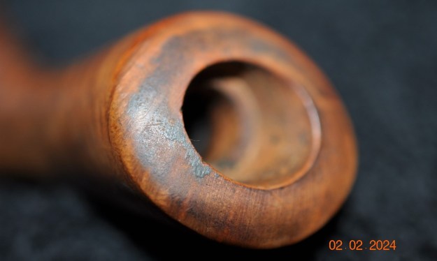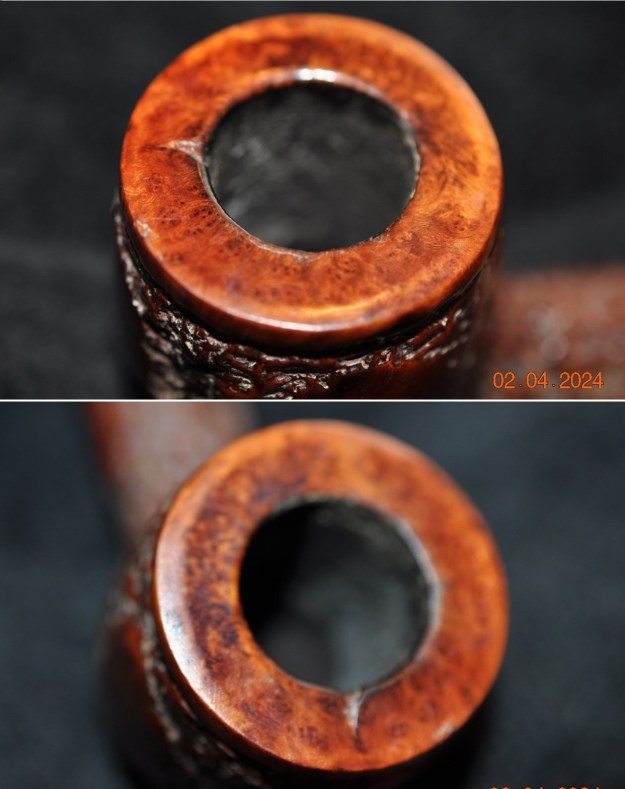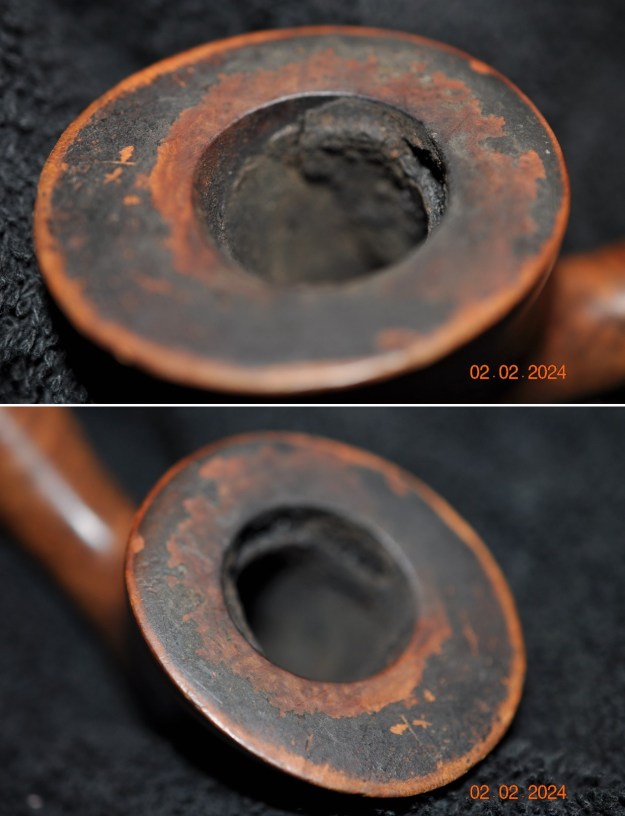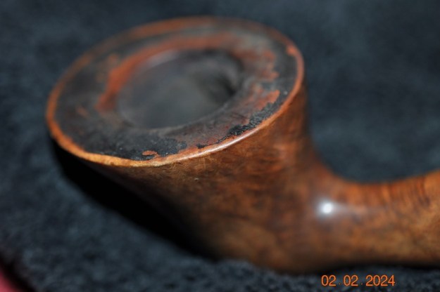 Jeff took photos show the condition of the bowl and the stem. The photos of the bowl and rim show the cake in the bowl and the lava overflowing onto the rim top. The grain on the top of the bowl and the inner and outer edge of the rim looks really good. It was hard to know what the edges and top really looked like until we cleaned it. The taper stem was oxidized, calcified and had tooth chatter and marks on both sides of the stem near the button.