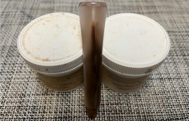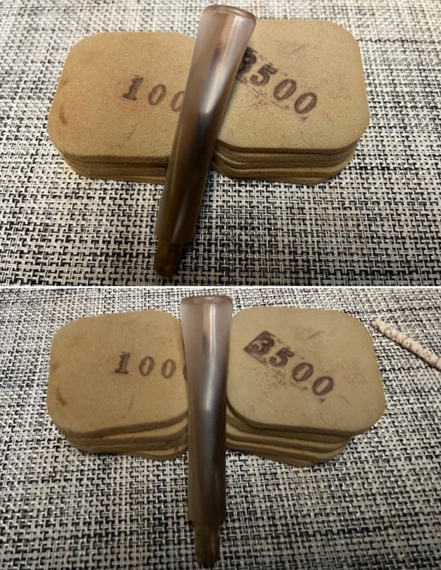 I set the bowl aside and sanded the stem with the 2 inch square 320-3500 grit sanding pads. I wiped down the stem after each sanding pad. I was able to remove the tooth marks and chatter on both sides with the pads. The stem looked very good.