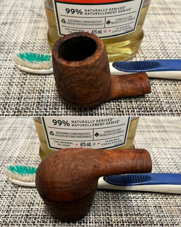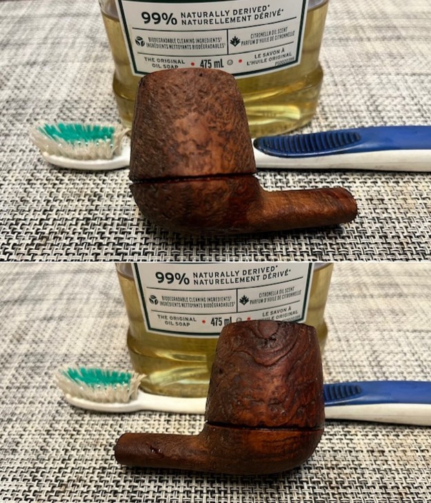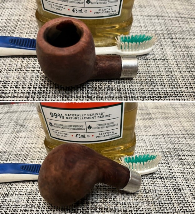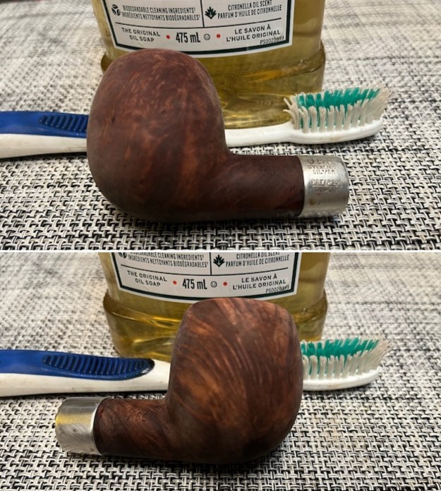Now it was time to work on the pipe. Jeff carefully reamed the bowl with a Savinelli Fitsall Pipe Knife. He scrubbed the exterior with Murphy’s Oil Soap and a tooth brush to clean off the grime off the finish and the overflow of lava on the brass rim cap. The cleaning had removed the grime on the rim top. He mentioned he could not remove the stem but he cleaned up the internals of the pipe as best he could with pipe cleaners, cotton swabs and alcohol to remove all of the oils and tars in the pipe. The inside of the stem was very clean. He scrubbed the stem surface with Soft Scrub to remove the grime and oils that were on it. The fit of the stem to the shank was very good, snug enough that Jeff was uncomfortable trying to remove it. It was hard to know if the tenon was friction fit or threaded with a pipe this old. When it arrived here in Vancouver it was a clean pipe and I knew what I had to work with. I took photos of it before I started my part of the restoration.