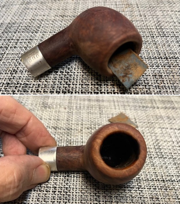With that new information, thanks to the patent number, I know what I am dealing with. It is an old timer – potential from the 1920s. The outer bowl is Redmanol or Bakelite and the inner bowl is clay. The rim cap has a cork gasket and is slid or pressed on to the top of the bowl. It was definitely a part of the ongoing search for a cooler and drier smoke. Now it was time to work on it.